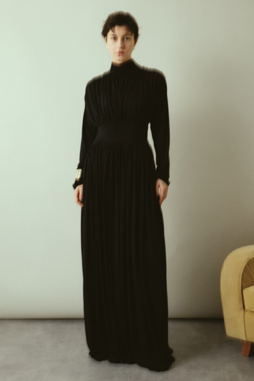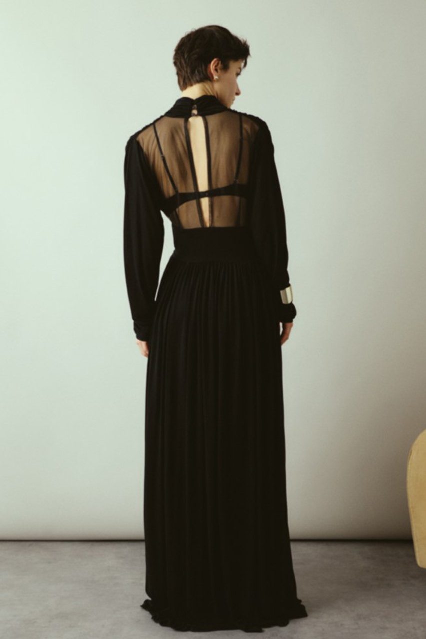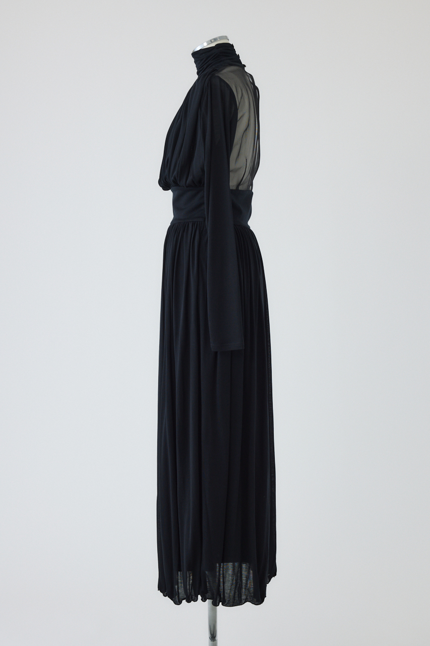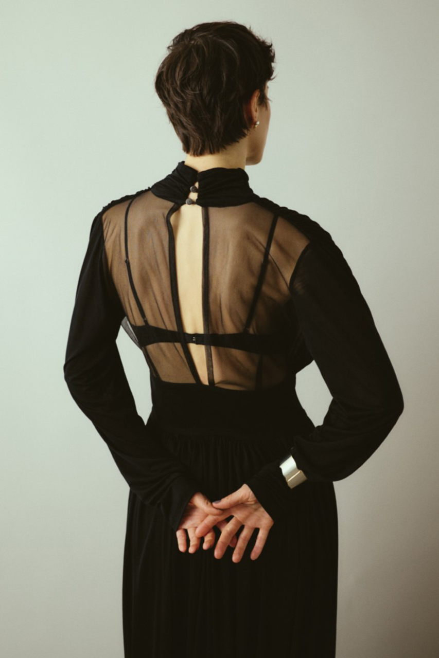 たっぷりとしたギャザーが直線的なシルエットと印象的な美しいドレープを描くマキシ丈ドレス。バックスタイルのシースルー切り替えが大胆かつセンシュアルな魅力を放つ特別な1着。上身頃背中部分にセンシュアルなシアー素材。ウエストの切り替えでスタイルアップ効果も。特別なシーンにもマッチする華やかさで、パーティーやお呼ばれの席にも最適。ドレープの美しさを活かしたエレガントなコーディネートを演出します。