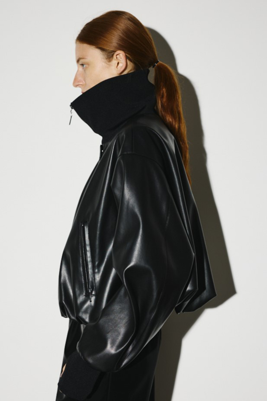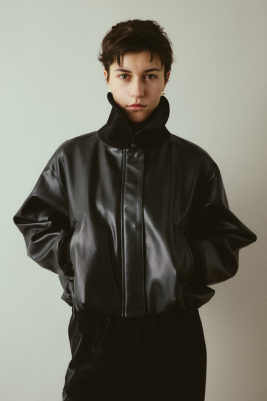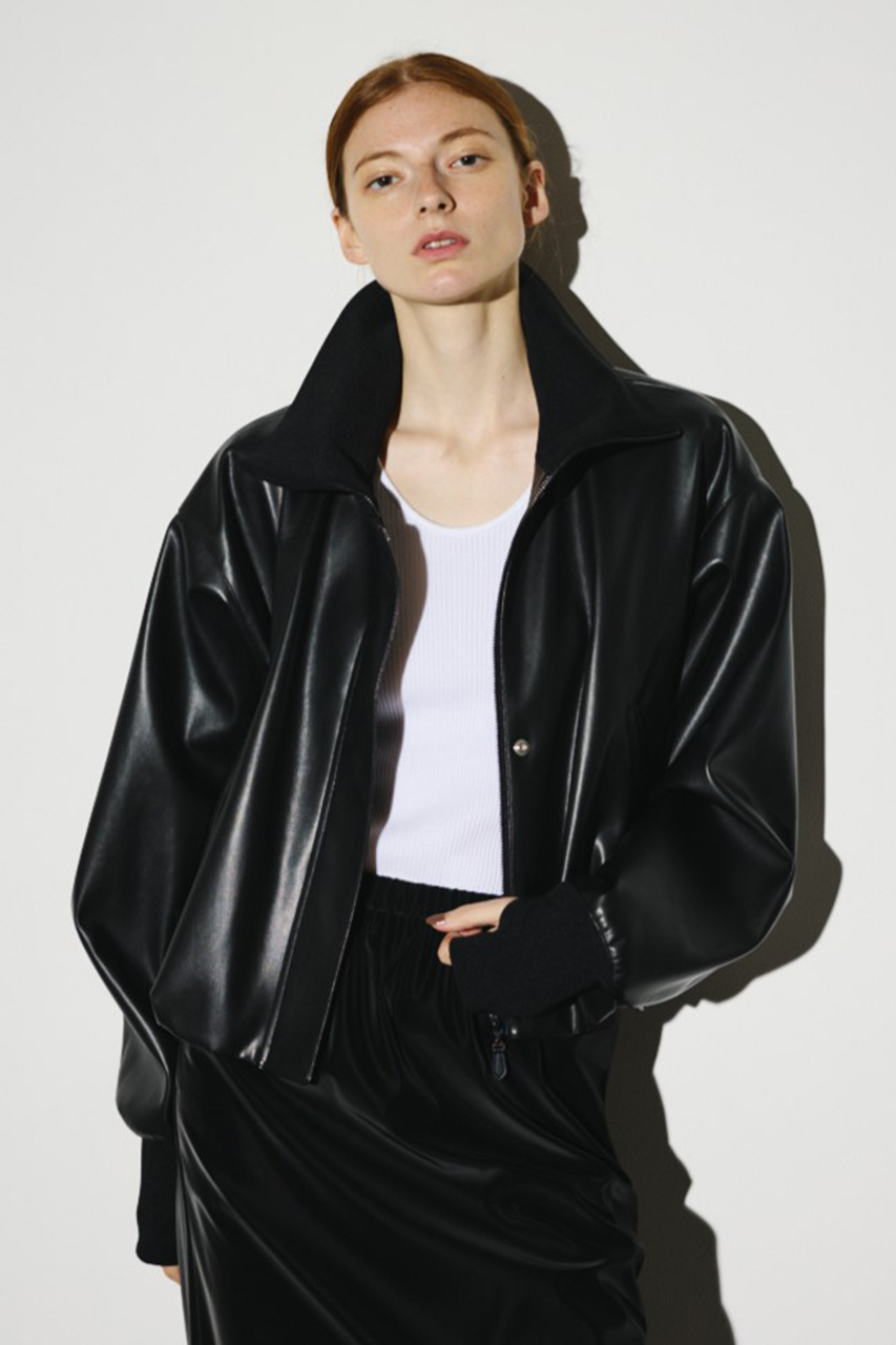 まるで本物のような質感と光沢感を持つフェイクレザーとリブをドッキングさせたジャケット。コンパクトな着丈と大胆なバルーンシルエットが特徴です。口まで隠れるリブネックがエッジの効いたフォルムを形成。袖口にはサムホール付きで機能性も兼ね備えています。とことんマニッシュなパンツスタイルはもちろん、あえてIラインのワンピースやスカートに合わせたバランスもメリハリが出ておすすめです。