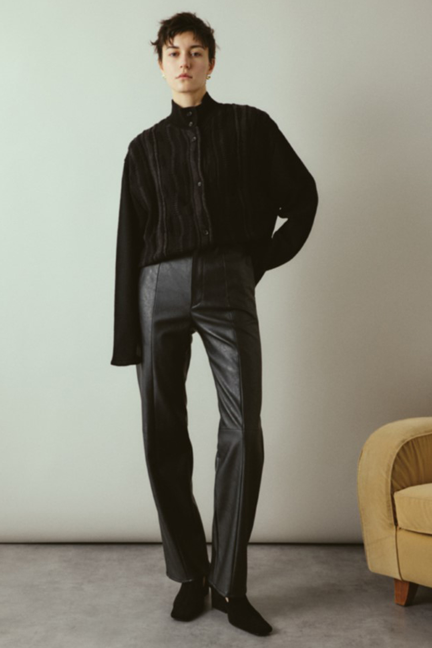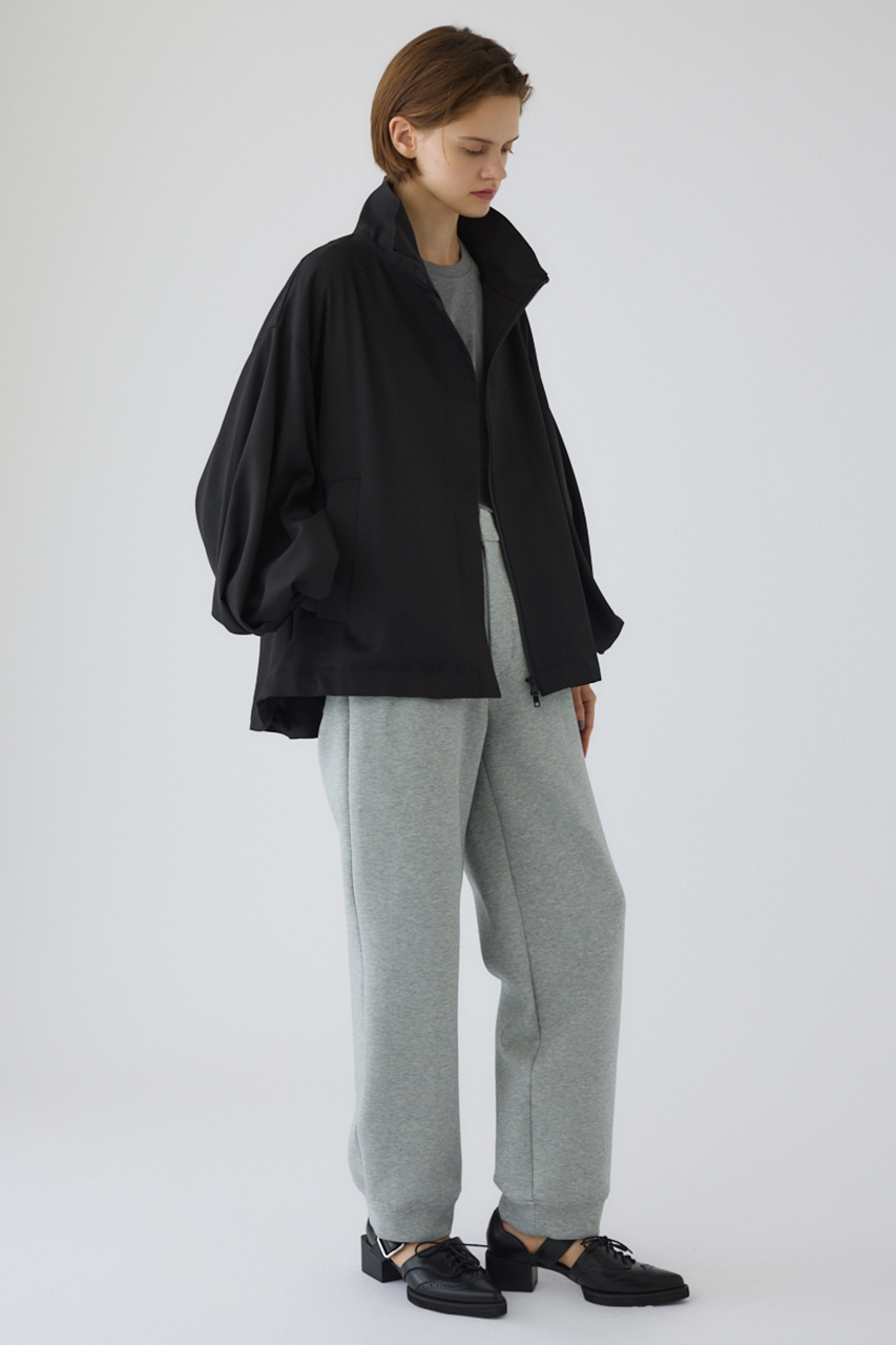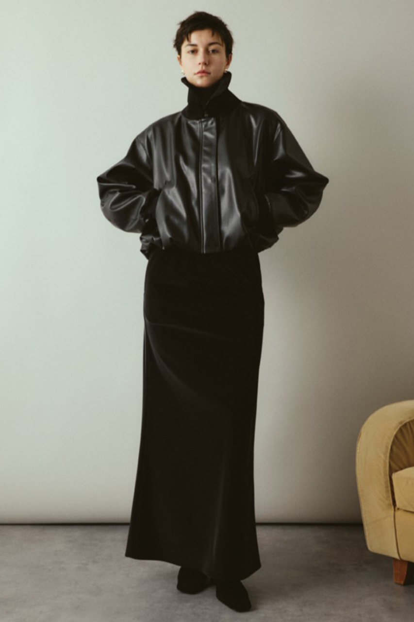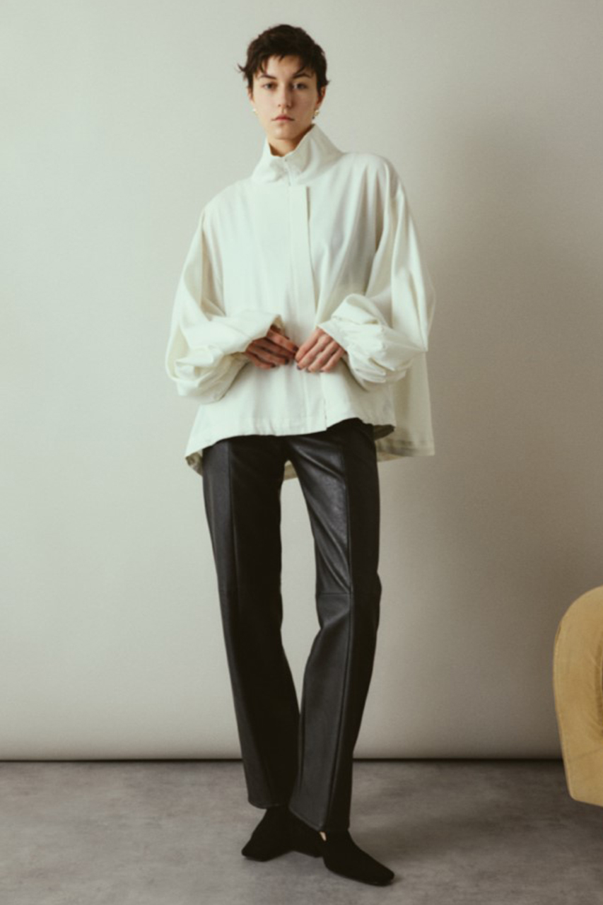 まるで本物のような質感と光沢感を持つフェイクレザーとリブをドッキングさせたジャケット。コンパクトな着丈と大胆なバルーンシルエットが特徴です。口まで隠れるリブネックがエッジの効いたフォルムを形成。袖口にはサムホール付きで機能性も兼ね備えています。とことんマニッシュなパンツスタイルはもちろん、あえてIラインのワンピースやスカートに合わせたバランスもメリハリが出ておすすめです。