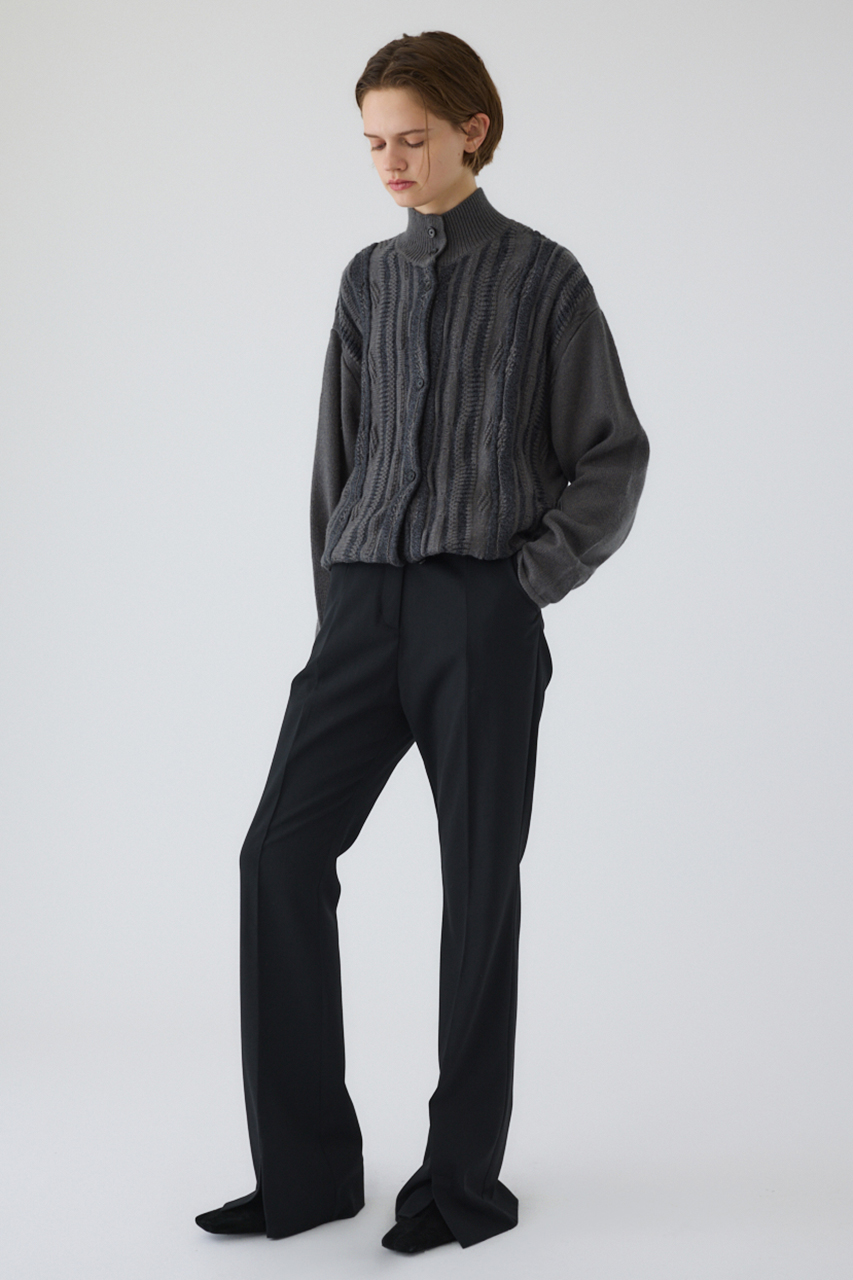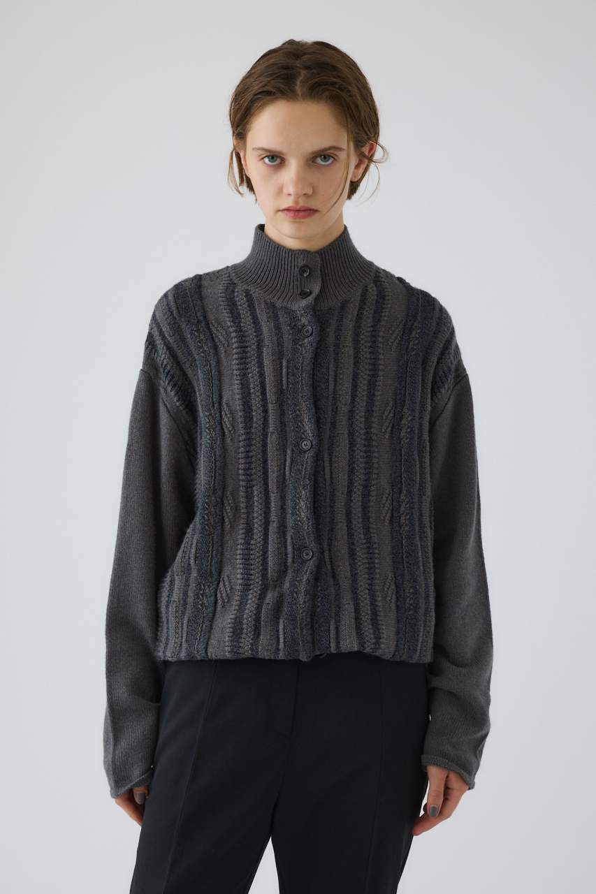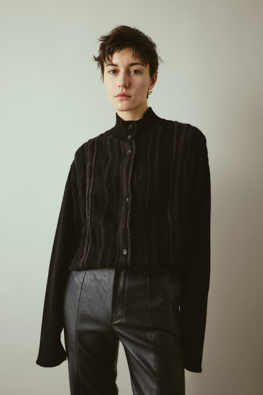 立体的なケーブル編み柄が目を引くスタンドカラーのニットカーディガン。ウールとカシミヤ入りで暖かみのある編み地。すっきりとしたシルエットでバランスが取りやすく、メンズライクかつヴィンテージ感のあるルックス。パンツスタイルにもスカートスタイルにもマッチする万能アイテム。ワードローブの定番として活躍すること間違いなしです。