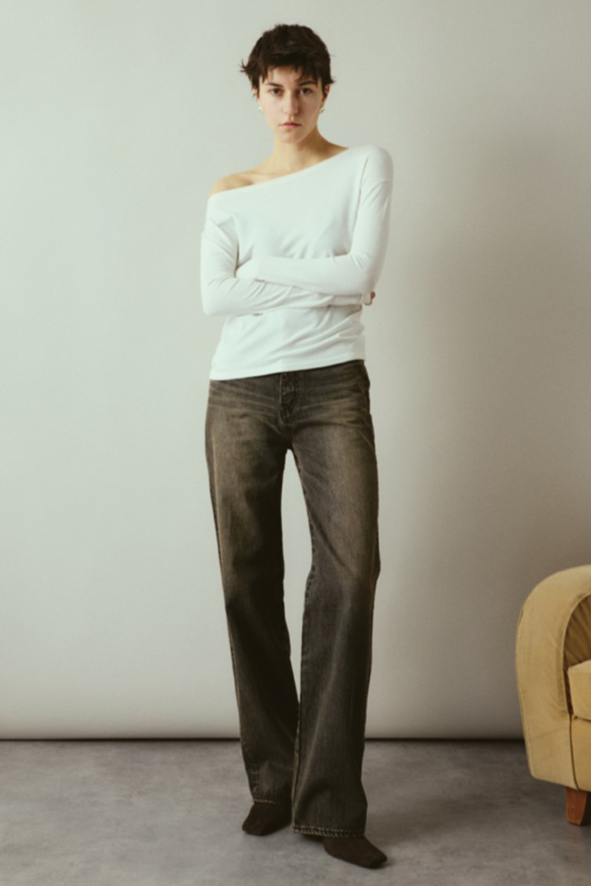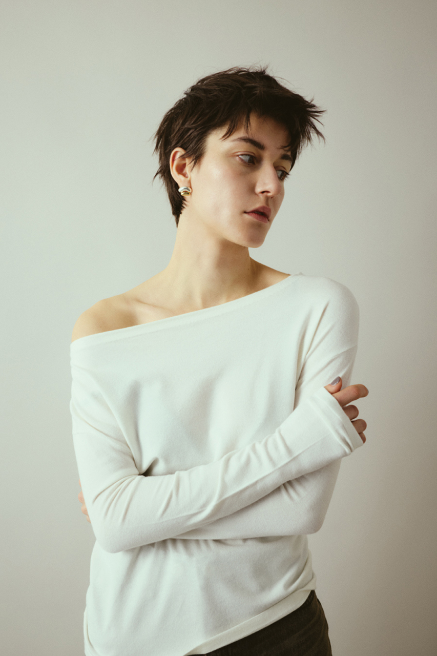 エフォートレスに魅せる、女性らしさと抜け感を兼ね備えたニットトップス。シンプルながらもサムホール付きの程よいフィット感がボディラインを美しく引き立て、さりげない色気を演出します。しなやかな天竺編みで肌なじみが良く快適な着心地。肩を出したアシンメトリーなオフショルダーの着こなしもおすすめです。