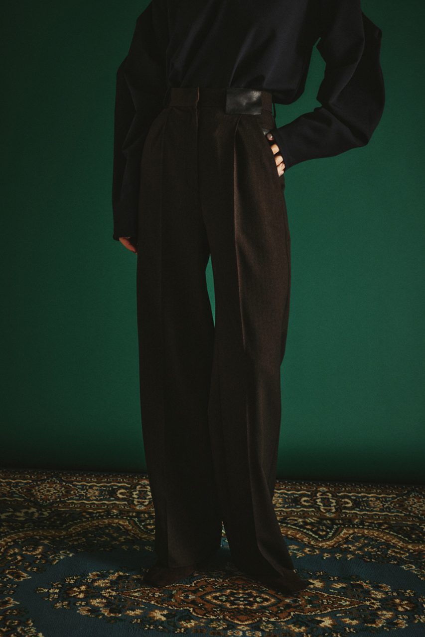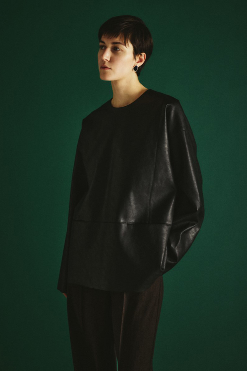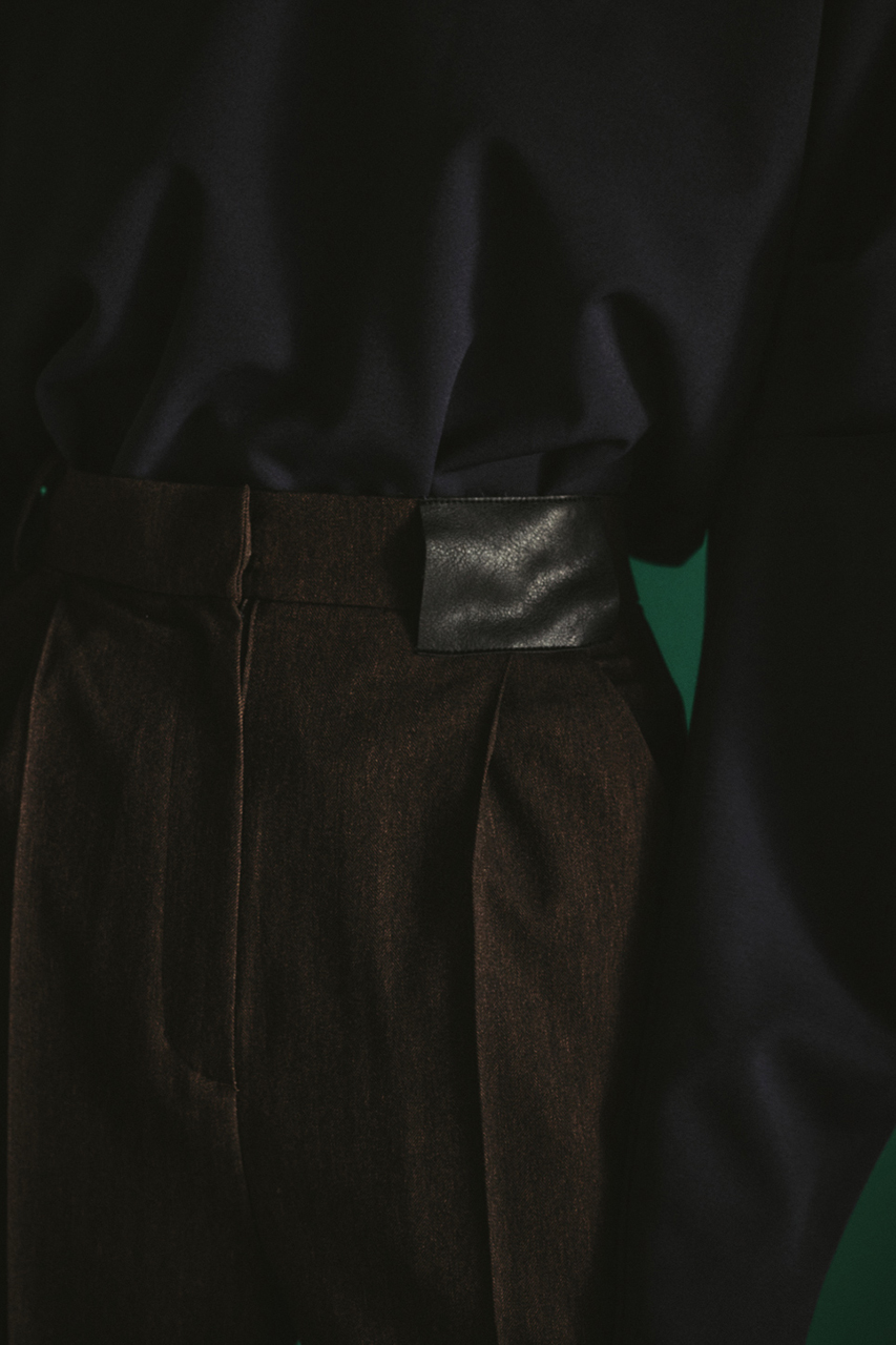 トラディショナルなヘリンボン柄にエッジの効いたフェイクレザーを組み合わせることで、モードな印象に昇華させたデザインが魅力。ウールのような温かみのあるルックスのヘリンボン生地に、アクセントとしてフェイクレザーを部分的に使用しました。シワになりにくく、ご家庭での水洗いも可能なイージーケア素材。
