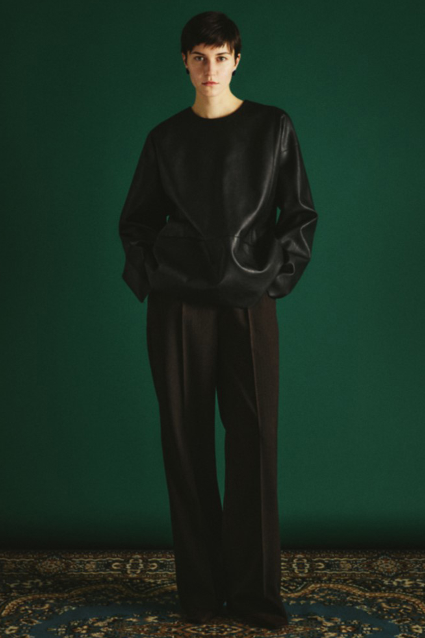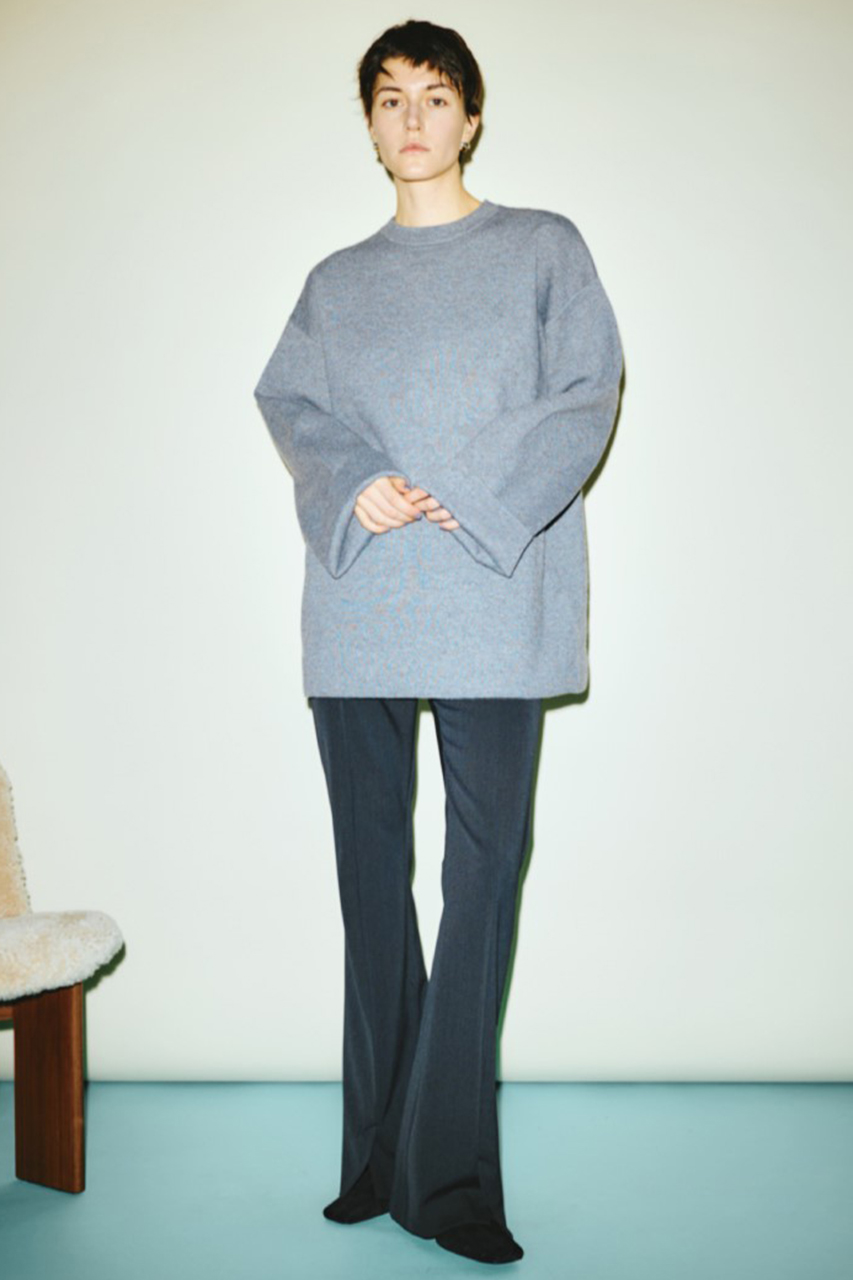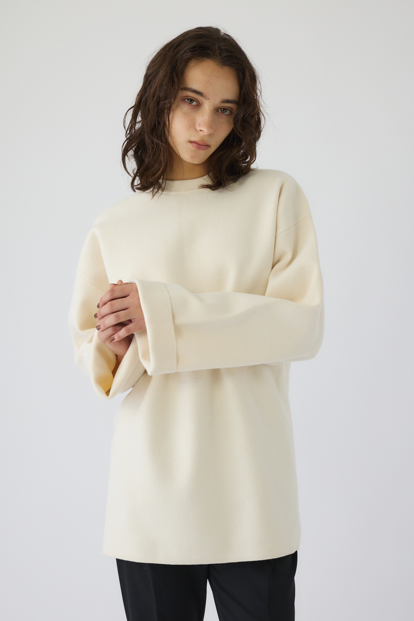 あえて長く設定した袖を折り返して着る、ミニマルながらも計算されたデザインが魅力のニット。ヒップまで隠れるリラックスしたシルエットが、気負わないのにシックで品格のあるスタイルを演出。レーヨンをブレンドした、肉厚でハリのあるスムース編みのニット地を使用。r>滑らかな肌触りで着心地が良く、身体のラインを拾いすぎないゆったりとしたシルエットです。袖はあえて長めに設定しています。デザインのポイントである長い袖は、くしゅっとさせたり折り返して手首を見せたりとこなれ感のある着こなしを演出するのがおすすめ。ゆったりとしたシルエットなので、ボトムスはスリムなパンツやタイトスカートを合わせるとバランス良くすっきりとまとまります。