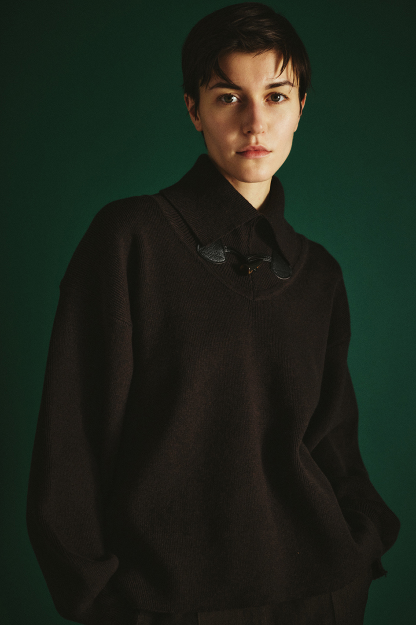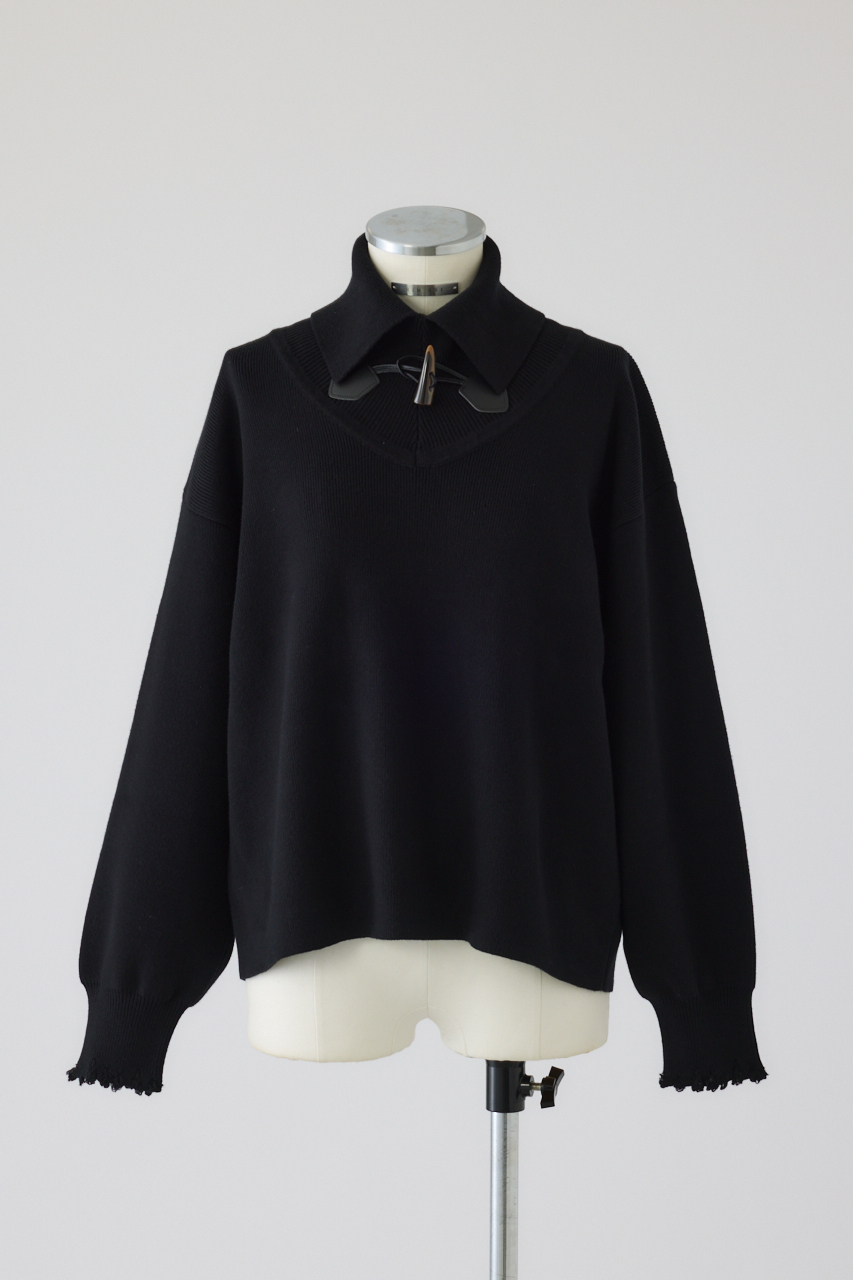 フロントにあしらったトグルデザインが、遊び心とマニッシュなエッセンスをプラスしてくれるニットトップス。シンプルなデザインながらも存在感があり、いつもの冬の日常着を新鮮な印象にアップデートしてくれます。滑らかな表面感が美しい、カシミヤ混コットンの糸を使用。程よい厚みとハリ感のある総針編み。フロントにはデザインのポイントとなるトグルをオン。デザイン性があるため、シンプルなボトムスを合わせるだけでコーディネートが完成します。一枚で着こなしの主役になるアイテム。