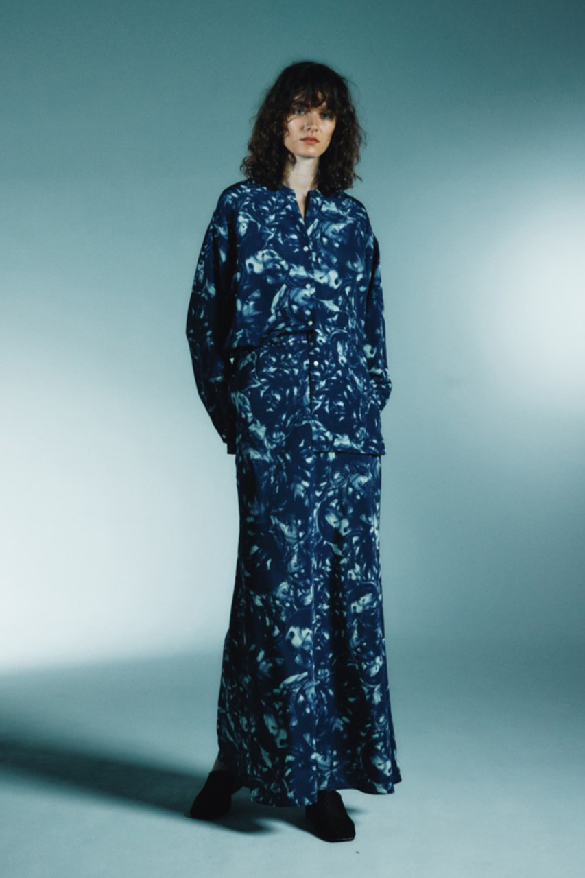 乱気流をイメージした抽象的なアート柄が目を惹くバンドカラーブラウス。動くたびに優雅な表情を見せる軽やかな素材感と一枚で主役になる存在感が魅力です。同素材のスカートと合わせれば、ドレスのような華やかなスタイルも楽しめます。軽やかで落ち感のある薄手のポリエステル生地に乱気流をイメージした幻想的なプリントを施しました。柄の持つ芸術性を最大限に引き立てるため、首元はミニマルなバンドカラーですっきりとクリーンに仕上げています。ジャケットの中などから柄を覗かせる着こなしが特におすすめです。同素材のAir turbulence painting skirtと合わせたセットアップスタイルなら、まるでドレスのような圧巻の装いが完成します。