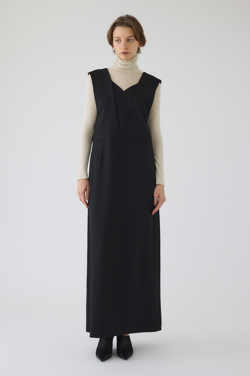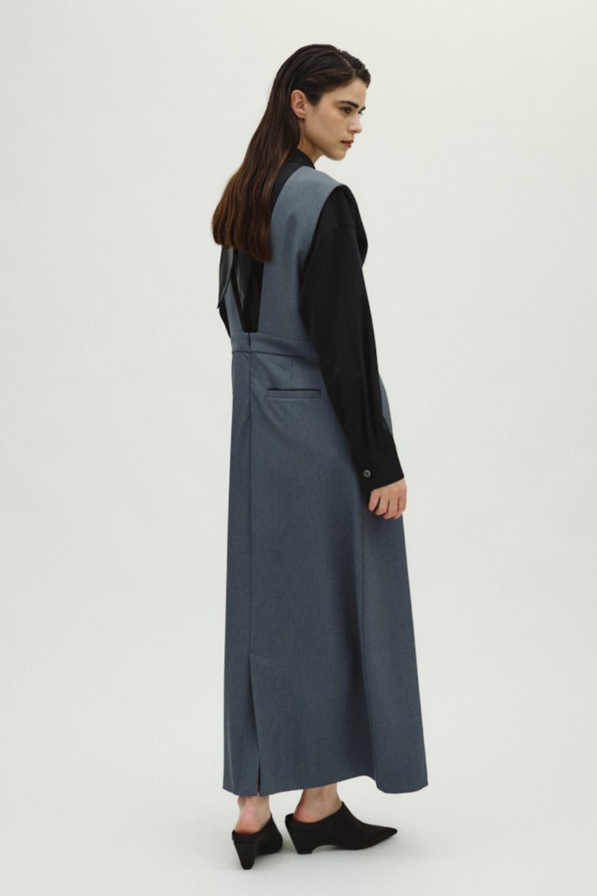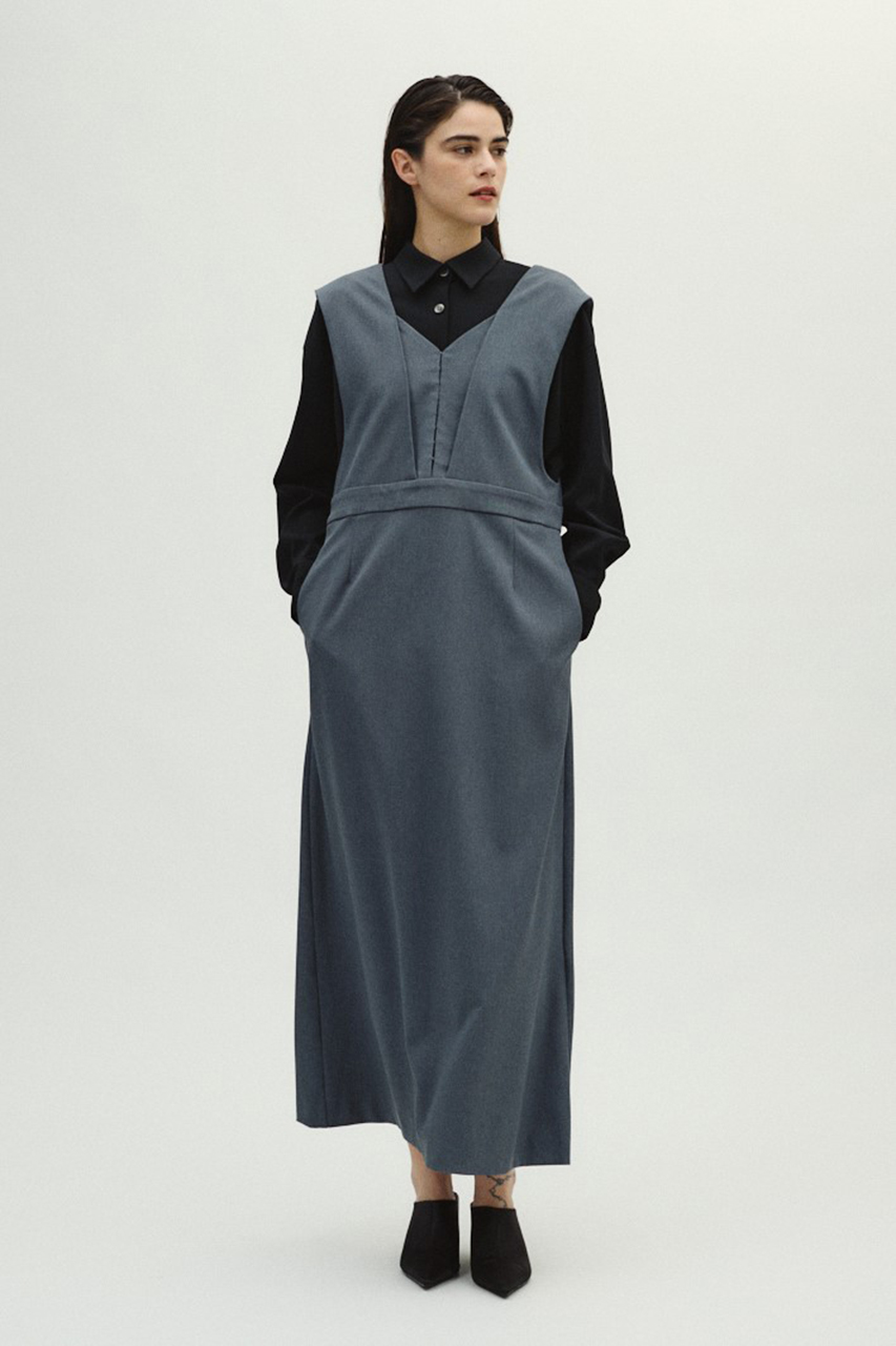 胸元にあしらったレイヤードデザインが、知的で洗練されたアクセントを添えるジャンパースカート。シャープなVネックと高いウエスト位置が縦のラインを強調し、着るだけでスタイルアップを叶えます。程よいハリ感としなやかな落ち感を両立した、きれいめなツイル生地を使用。ボディラインを拾いすぎない美しいシルエットを描きます。オールシーズン着用可能な素材感も魅力です。ブラウスやタイトなニットを合わせればオフィスカジュアルや綺麗めなお出かけスタイルに、Tシャツやカットソーを合わせればこなれたデイリースタイルに。合わせるインナー次第で雰囲気を変えられるため、着回し力が高く、大人のワードローブで活躍する一枚です。