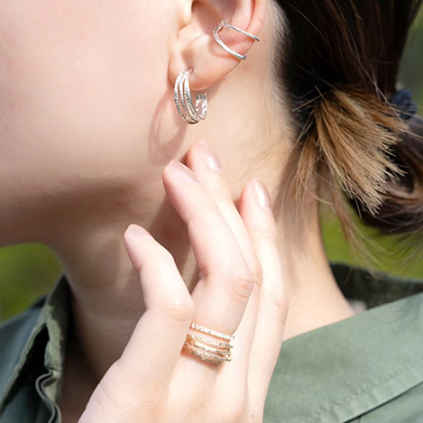 大好評の“HELIX”コレクション。シンプルなフォルムに、幾何学模様やランダムに重ねた直線をほどこした繊細なデザインで、纏ったときに美しさが際立ちます。KAORUの美意識を存分に感じられるコレクションで、リング・ピアス・イヤーカフと豊富なラインナップも魅力。