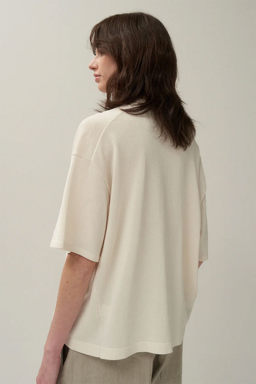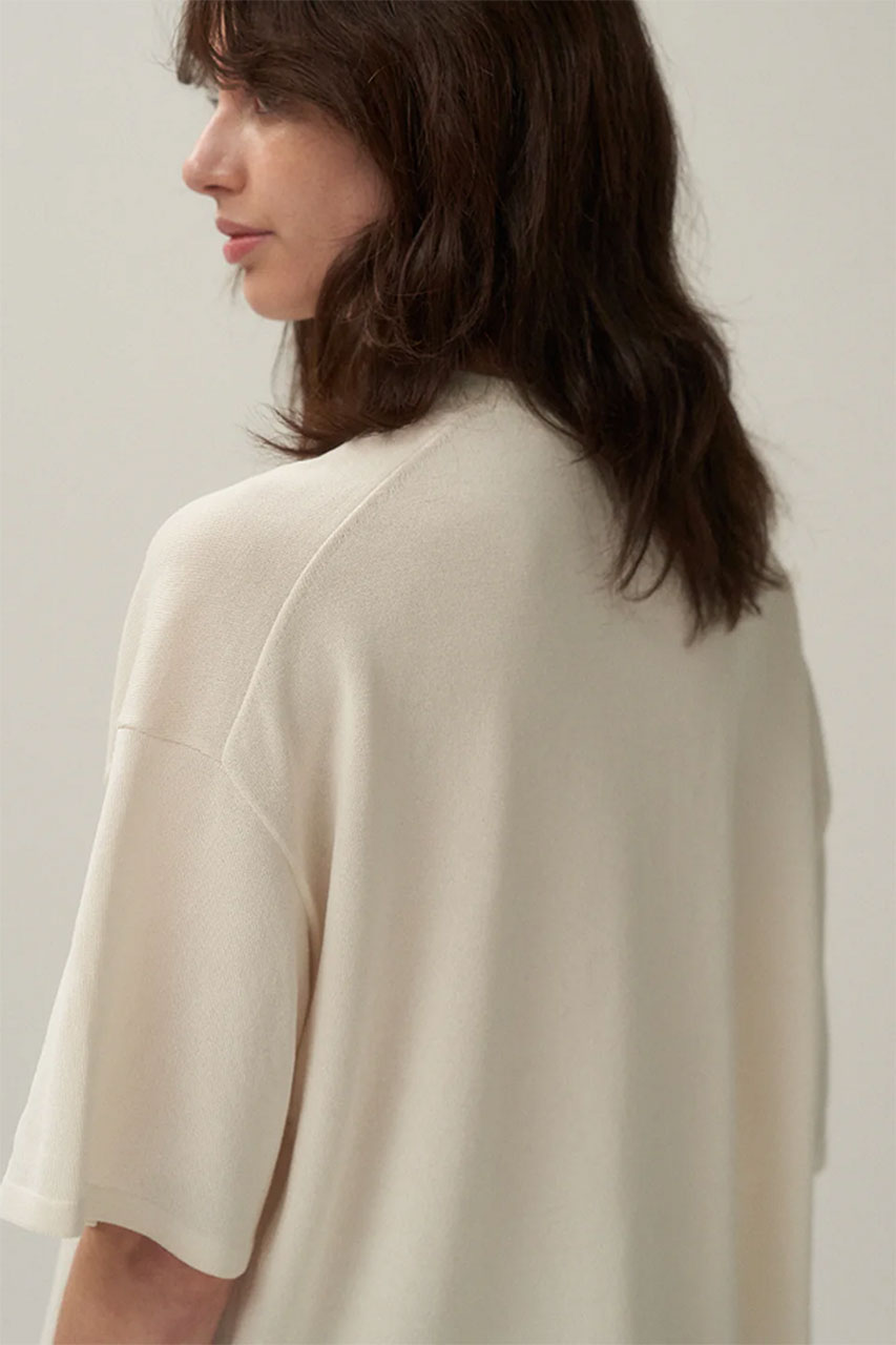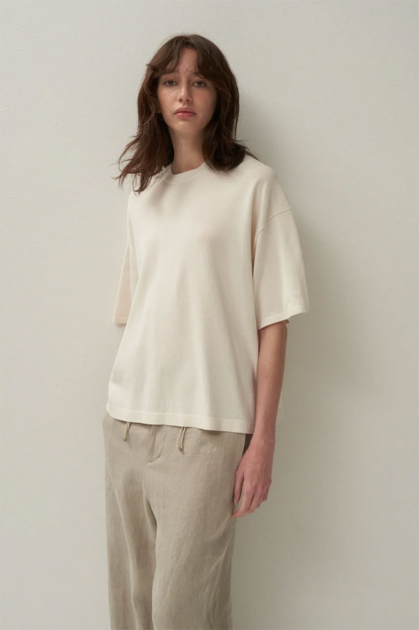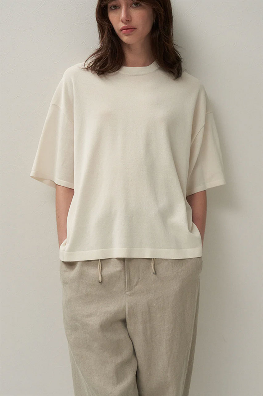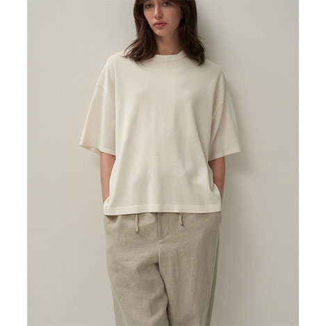 ややオーバーサイズのボックスシルエットが定番として選びたくなる半袖セーター。凹凸のある強撚糸を限界度目で編み立てることで、ニット特有のやや荒い目面とサラっとした着心地、程よい透け感を演出。裾はリブで縮まないように、Tシャツのような仕様に。マニラ麻原料を使用したしなやかで柔らかい肌あたりの和紙糸を使用したニット素材で、和紙は特殊な多孔質構造をしており、リネン以上の吸湿性、速乾性、消臭、UV 効果等の機能性を備えます。通常のニット素材にはない独特のハリコシと、サラッとしたドライタッチを合わせ持った「エイトン」オリジナル素材です。シルクやナイロンのパンツなど、光沢ある素材感とも相性抜群。