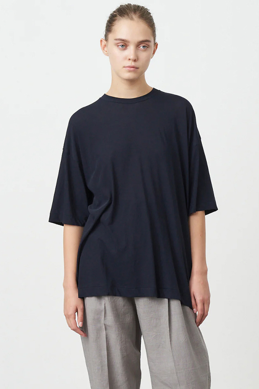 素材は、インドで手摘みされた超長綿のオーガニックコットン強撚糸を、和歌山県和歌山市で編み立てたジャージー素材を使用。強撚糸特有のさらりとした肌触りに加え、細番手のハイゲージによるほどよい透け感と光沢、落ち感のあるドレープが魅力。大きすぎない肩巾とやや高めの袖山設定でインナーにも1枚着にも使える万能もの。