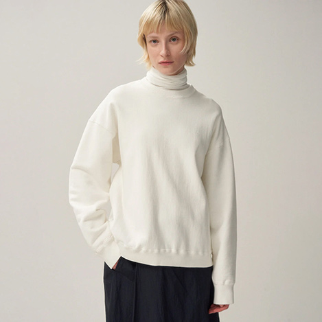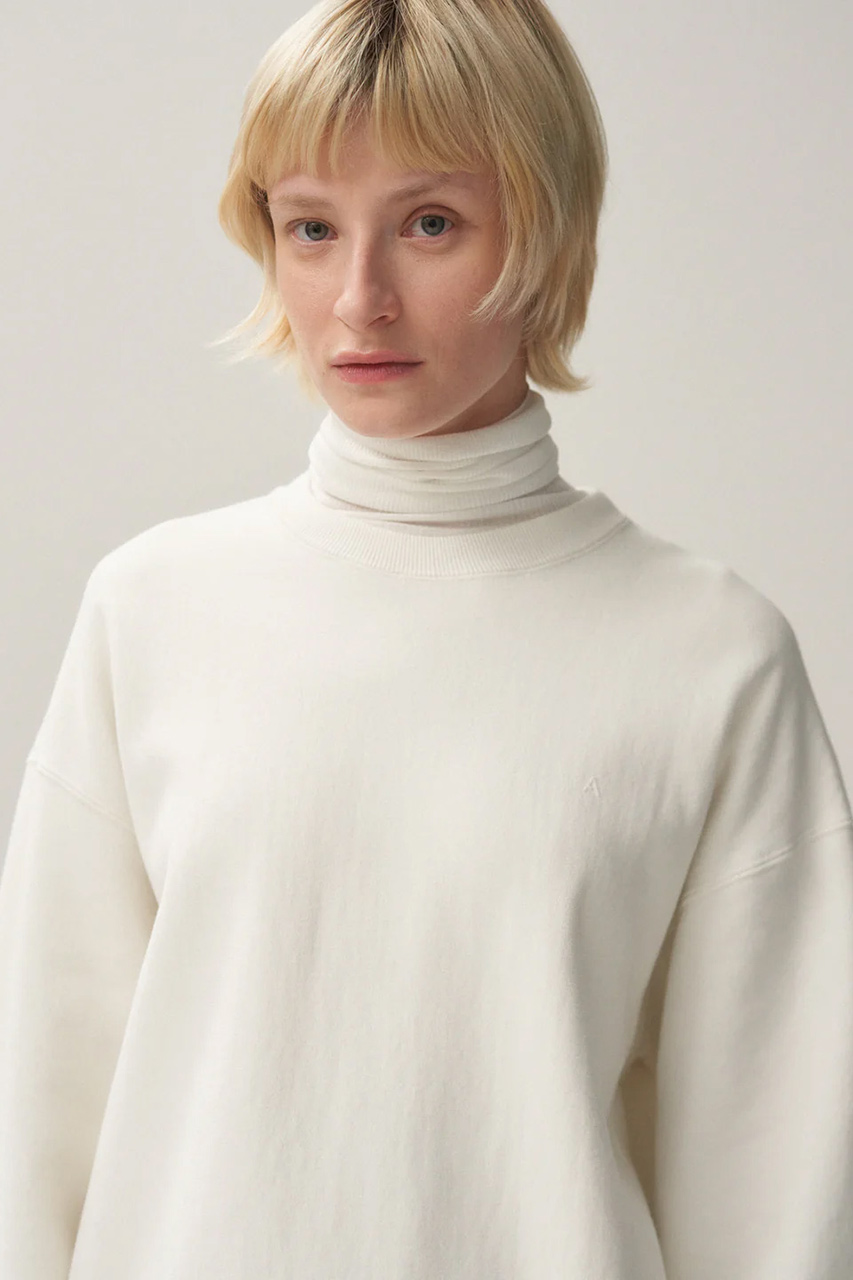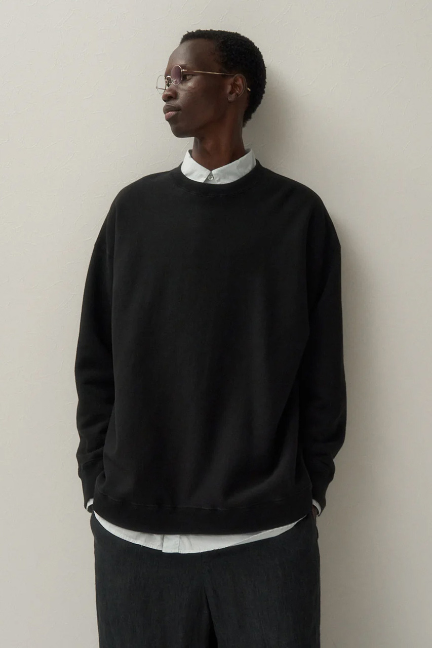 70年代のロサンゼルスの大学の購買部で売られていたカレッジトレーナーのヴィンテージを参考に作ったスウェット。高密度に編み上げることで耐久性はもちろんのこと、製品染めをしてしっかりと洗いを掛けているため、乾燥機に掛けても縮みが起きないという秀逸なアイテム。裏毛は表面、裏面、その間を繋ぐ面の3層構造にすることで、生地の伸びが圧倒的によくなり、間にたっぷりと空気を含むため、より暖かくなる、エイトンオリジナル素材が魅力。Tシャツのような横袖でカジュアルな印象に、袖口のトライアングルや胸元の""A""はフーディを継承している1枚。