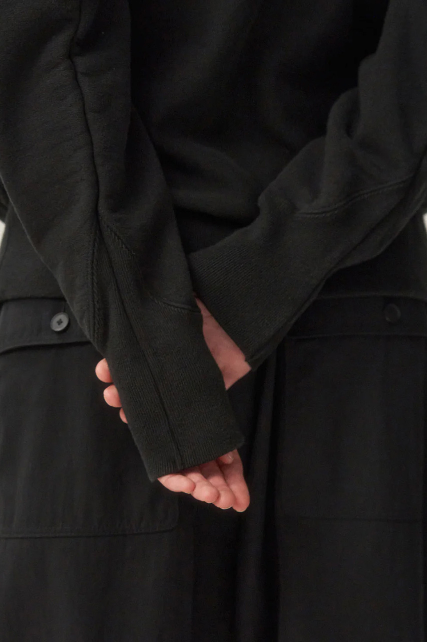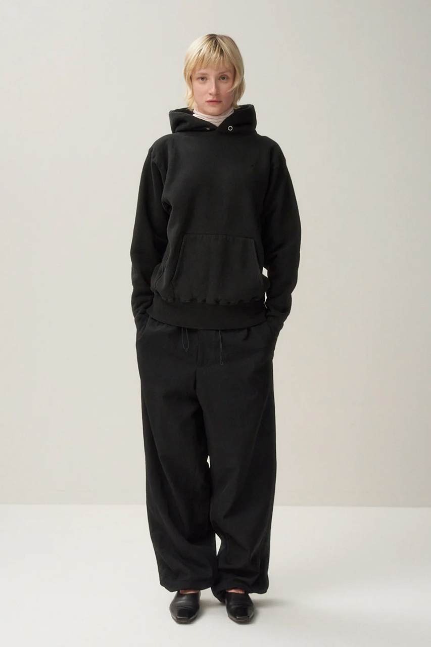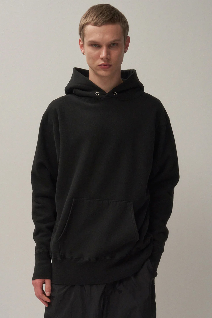シャープな三角形のフード、少し大きめなシルエットが目を惹くエイトンの定番フーディ。胸元の”A”は植毛フロッキーのため、剥がれることなくベルベットのような手触りが実現。高密度に、和歌山にて編み上げたジャージは、裏毛は表面、裏面、その間を繋ぐ面の3層構造にすることで、生地の伸びが圧倒的によくなり、間にたっぷりと空気を含むため、より暖かくなる1着。通常もっとも負担の掛かる袖口の部分は、力点を一点に集中させないようにリブをトライアングルに設計。両脇にはリブ編みのサイドアクションパネルを備え、着脱のしやすさと動きやすさをキープ。機能性とデザイン性を兼ね備えた1枚で差をつけてみて。