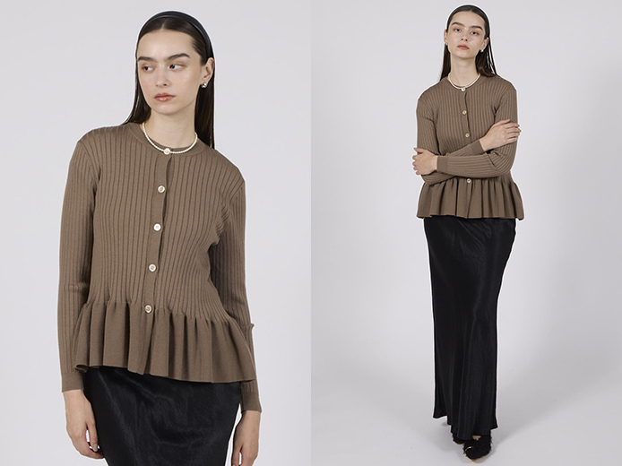 ウエストからふわりと広がるペプラムデザインが、女性らしい華やかさとスタイルアップを両立するカーディガン。オーストラリア産エクストラファインメリノウールと、ローパワーテンションストレッチ糸をブレンドし、特殊な紡績技術によって生まれた、光沢のある目面、ソフトな風合い、優れた耐久性が魅力。16ゲージのワイドリブ編みをフルファッションで丁寧に編み立てた1枚。