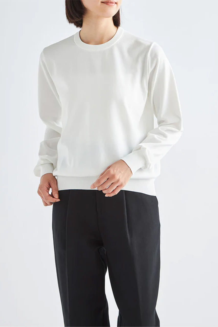 テイストや時代を選ばないベーシックな顔立ちのクルーネック。18ゲージ二重臼天竺編みをフルファッションで丁寧に編み立て、表は抗菌、防臭、速乾の機能性に優れたポリエステル糸を、裏には調湿機能に優れたキュプラコットンを使用。ソフトなハリと肌触りのよい快適な着心地はデイリーにヘビロテ確実。