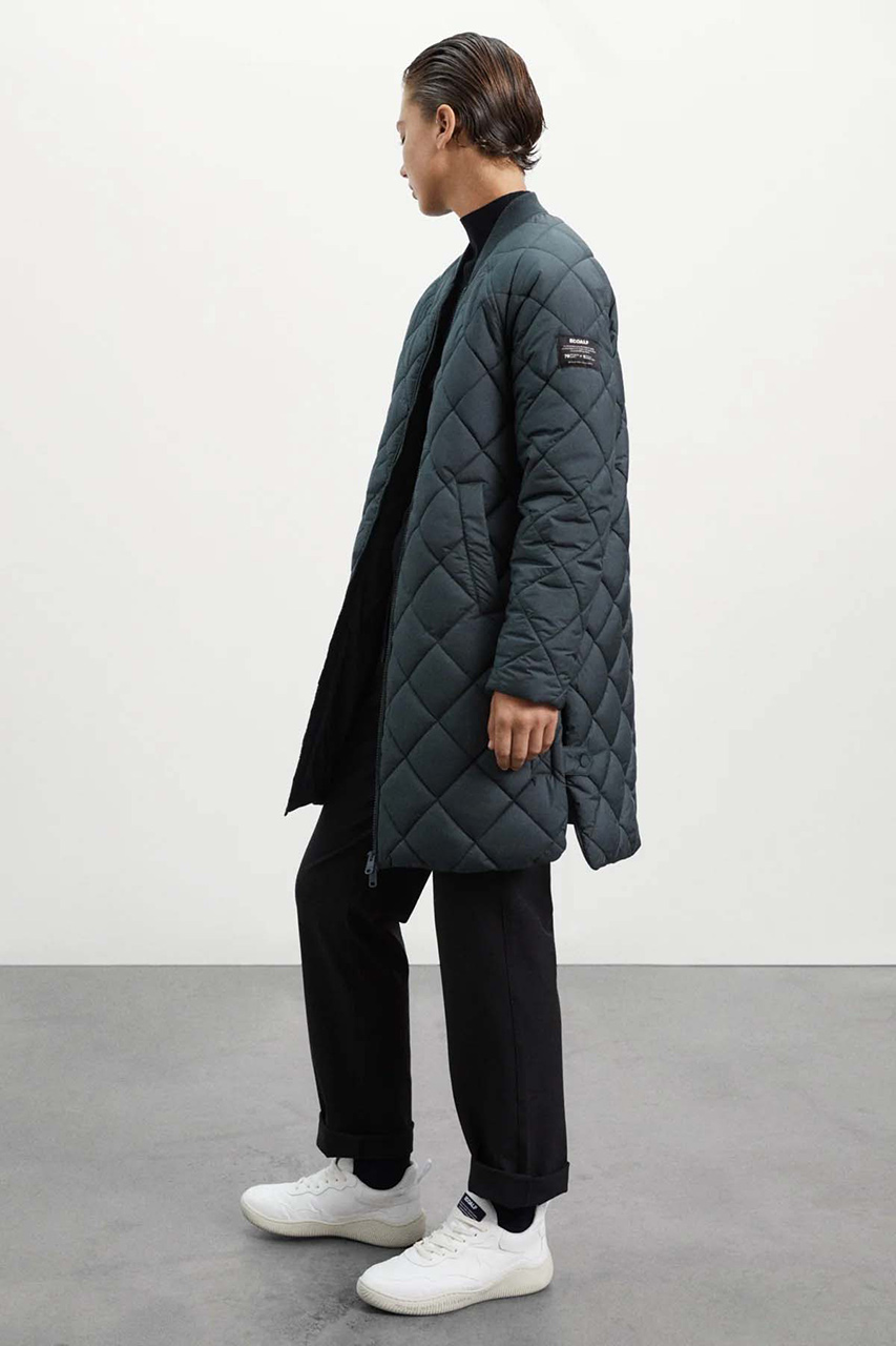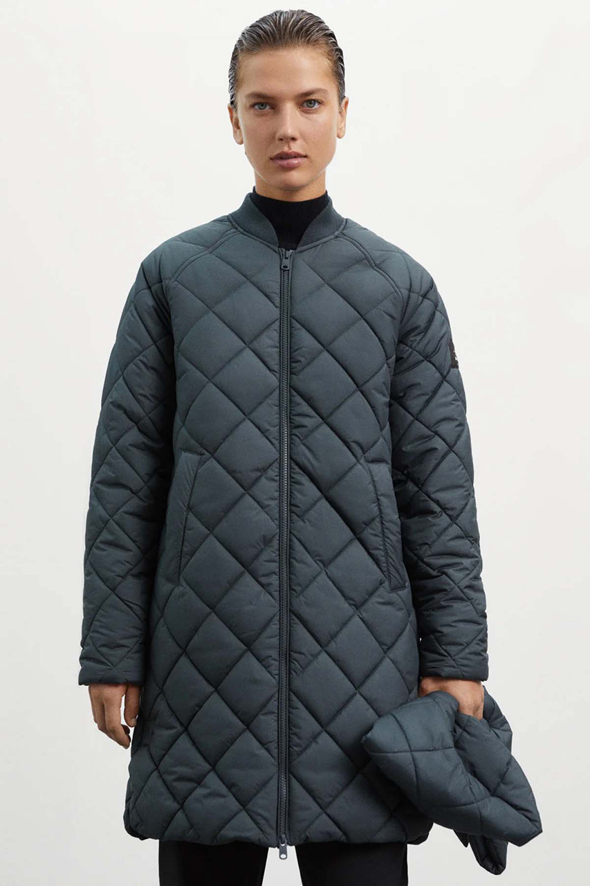取り外しができる同素材のマフラーが付いた、ダイヤキルトデザインの中綿コート。動物性の素材を使わず、表地から中わたまで、環境への配慮をこめたペットボトル由来のリサイクルマテリアルのみを使用しています。ソフトタッチでライトウェイト。保温性は持ちつつも、ラグランで動きやすく快適に着用できる中パデッドコート。動きやすさと美シルエットにこだわり、サイドに施したスリットもポイントです。