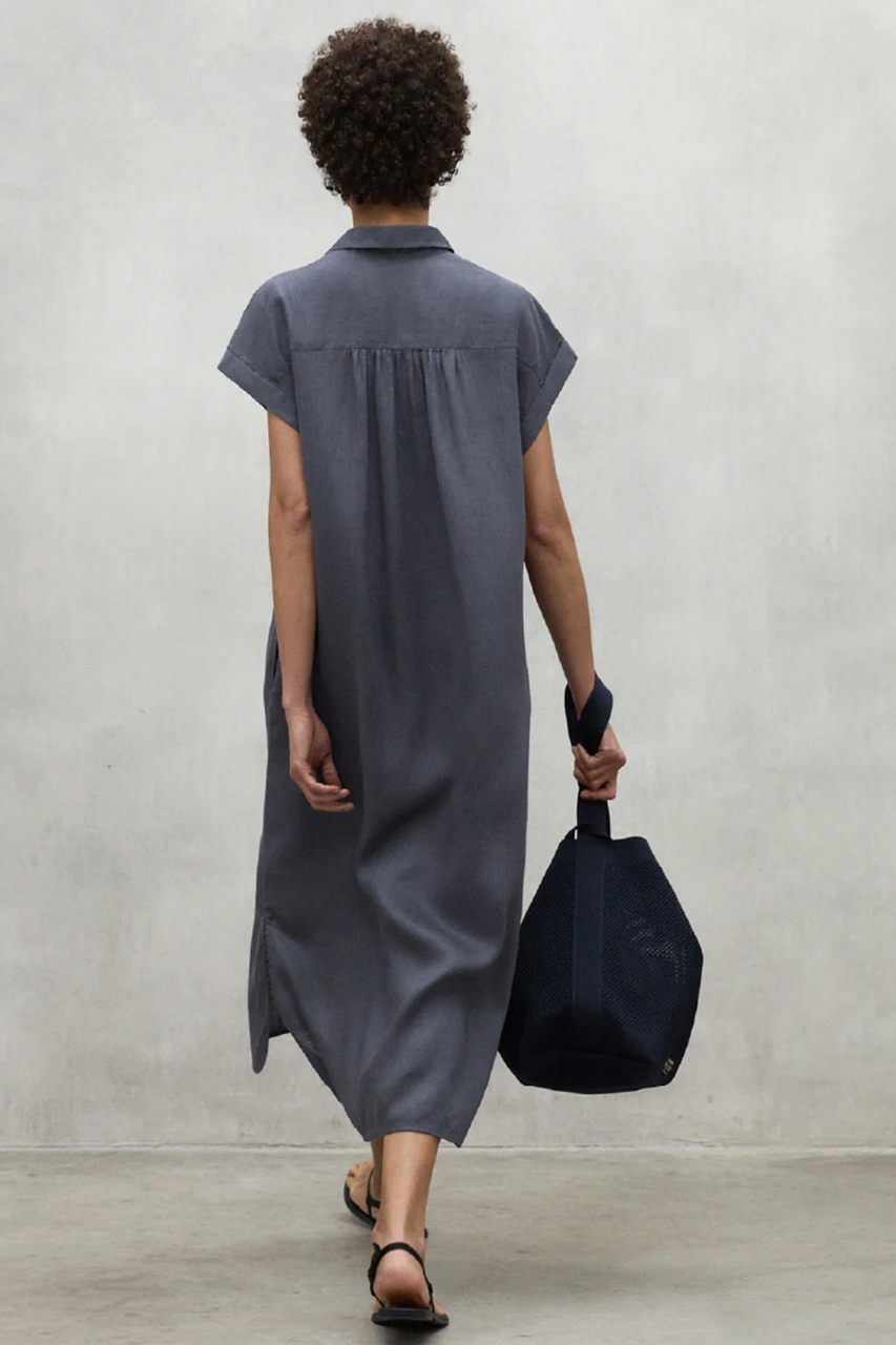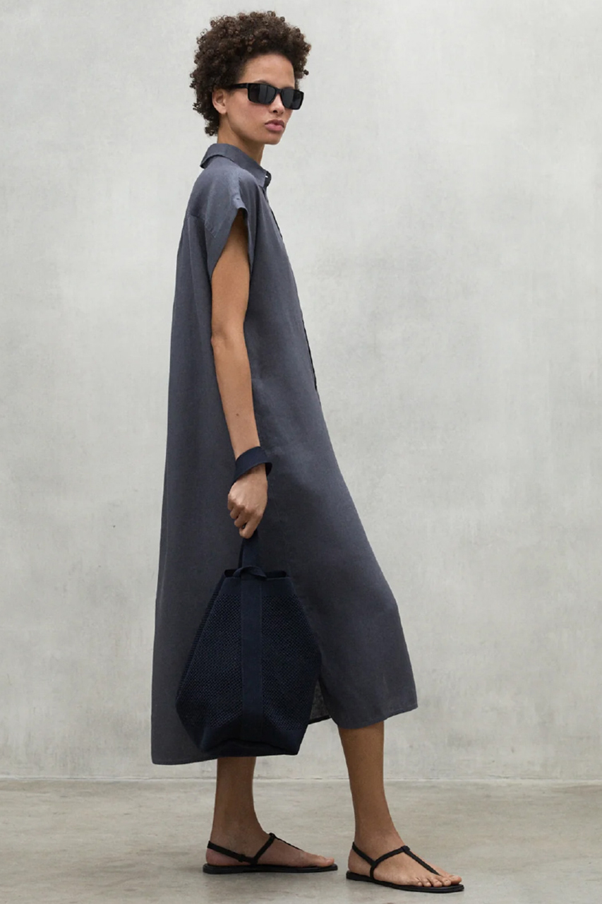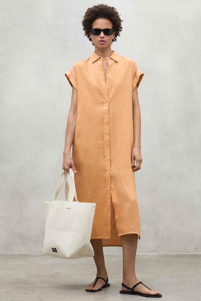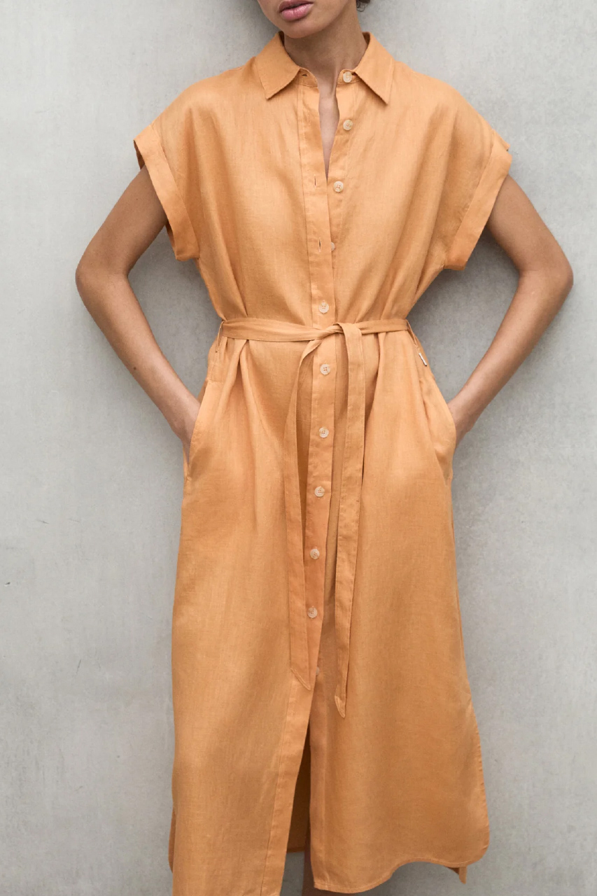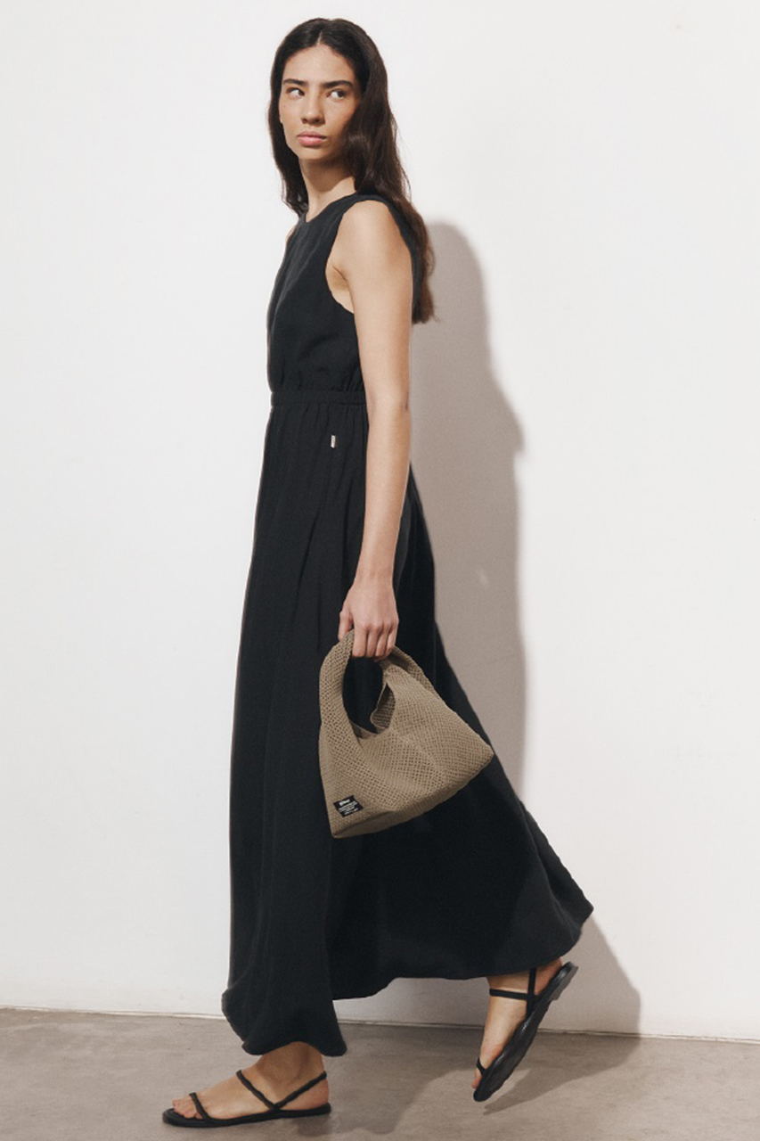 実はこのリネン、見た目や着心地の良さだけでなく、エシカル素材であることをご存じでしょうか。リネンは、涼しい気候の中で化学肥料や除草剤を使わずに短期間で育ち、病害虫にも強いため、農薬の使用を最小限に抑えることができます。さらに雨と日光だけで育つため、コットンに比べて栽培時の水使用量が大幅に少ないのも特長です。また、収穫したリネンは無駄なくほぼすべてを活用できる素材でもあります。そんなリネンを使用したドレスは、上品な微光沢と美しいドレープ感が魅力。ウエストのベルテッドデザインで、スタイリングの幅も広がります。
