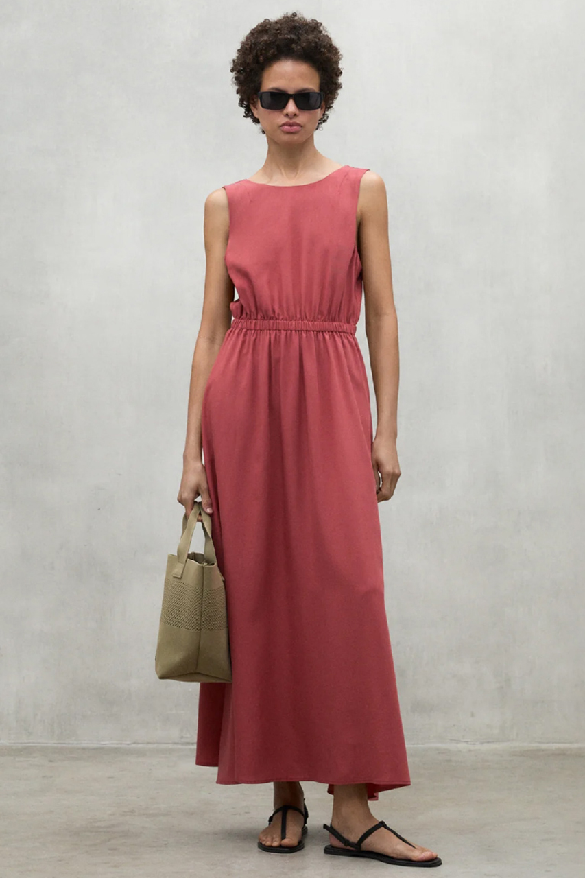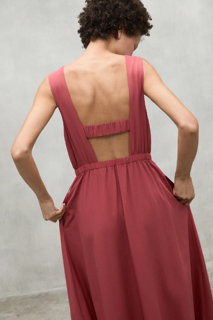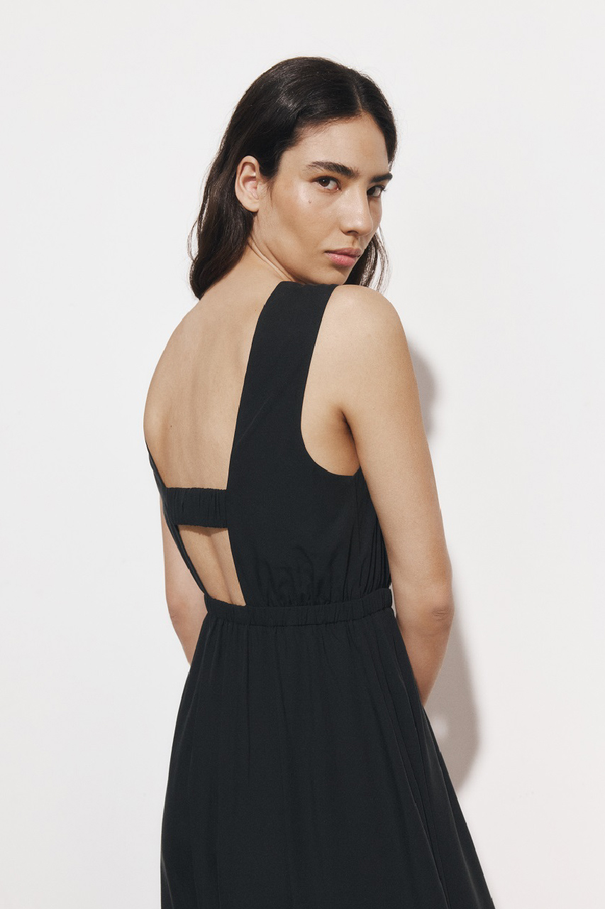 バックコンシャスなデザインが印象的なドレスは、1枚でリゾート気分を楽しめるエレガントな装いに。レイヤードすれば、タウンユースにも活躍する万能アイテムです。素材には、微光沢となめらかな風合いが魅力の再生繊維(セルロース)を使用。ナチュラルな表情が夏らしさを引き立てます。カラーは、サンセットのように鮮やかなレッドと、着回し力抜群のベーシックなブラックの2色展開。夏の気分に寄り添う、お気に入りの一着をぜひ見つけてみてくださいね。