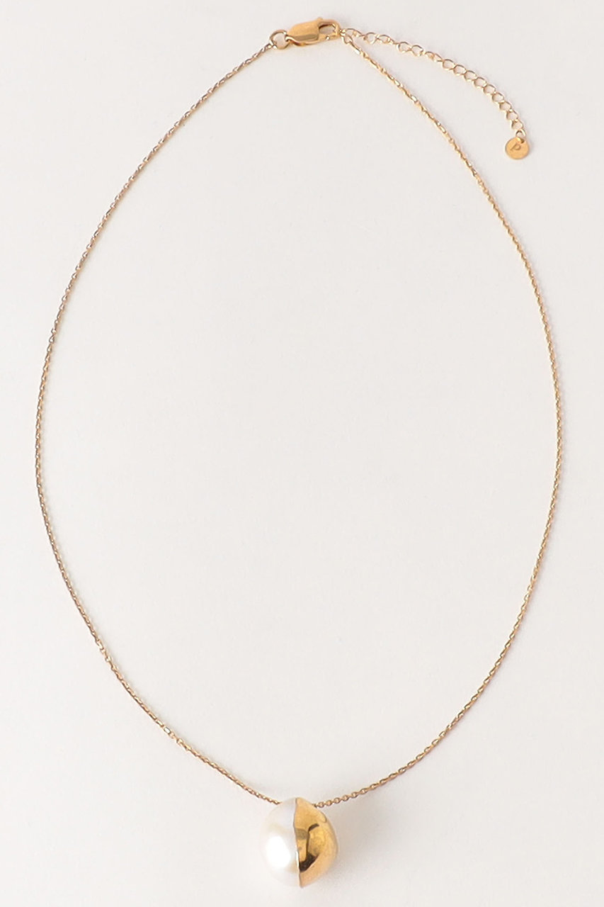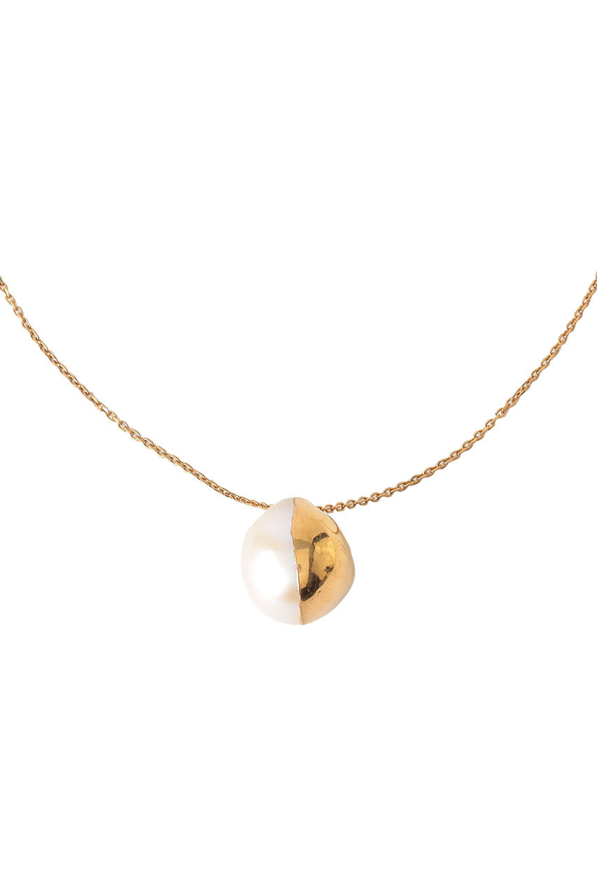 バロックパールのハーフサイドにPREEK dip coatingの特殊なメタル膜を施したネックレス。(純SV(SLV1000)+K18Gold plating)華奢なチェーンが繊細さを演出し、日常の装いにも特別なシーンにも映えるミニマルな存在感が魅力。