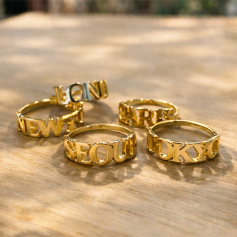 LONDON、NEWYORK、PARIS、SEOUL、TOKYOの5つの都市を象ったCITYリング。レターデザインが指先にアクセントを添え、手もとのスタイリングの主役に。ひとつで存在感を放つのはもちろん、華奢なリングとのレイヤードも楽しめます。好きな街や思い入れのある都市を選んで、自分らしいストーリーをまとって。