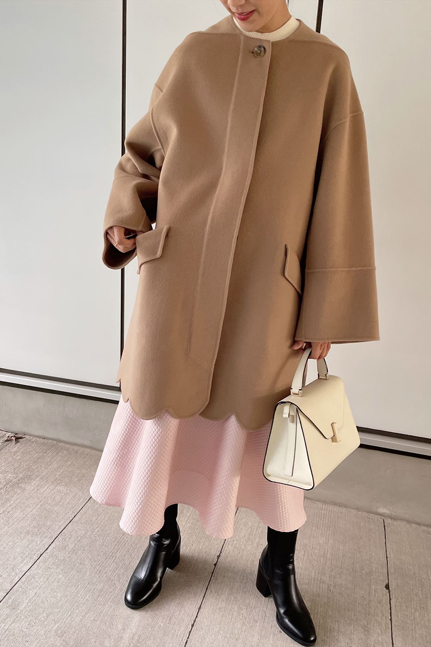 ノーカラーコートは裾のスカラップデザインでフェミニンな印象に。ロングスリーブから袖丈を折り上げることで、ショートスリーブにもなるようデザインしています。袖丈を少し短くするだけで重たくなりがちな冬のスタイリングが一気にすっきりとしたバランスに。