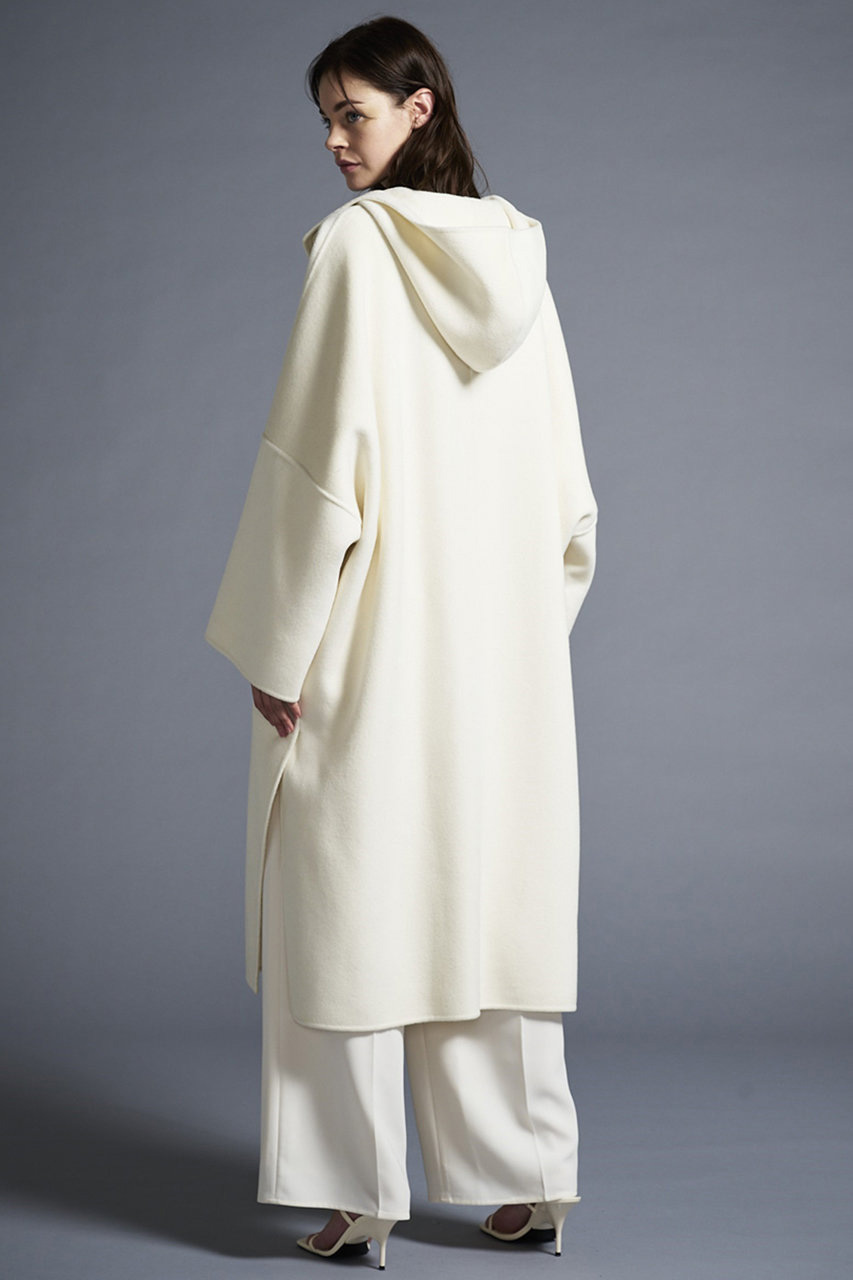上質な素材使いでカジュアルなフーディーコートも品よく格上げ。スカートにもパンツにも合わせやすく、秋から冬まで愛用いただけるデザインです。袖の仕様は、前出のコートと同じでショートスリーブにもアレンジ可能。裾に入った深めのスリットが軽やかさを演出。前立てから襟が少し立つため、開けても閉めてもサマになります。