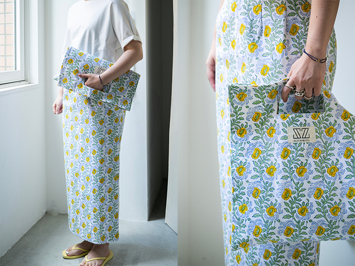 スクエアシルエットが旬なムードのクラッチバッグにレトロで華やかなフラワープリントが新登場。ハンドル仕様のバッグとしてはもちろん、半分に折って抱えればクラッチバッグとしても持てる2WAYで使い勝手抜群。「エスゼット ブロックプリント」のスタッフは同柄のキャンバススカートとのセットアップコーデをリアルバイ!