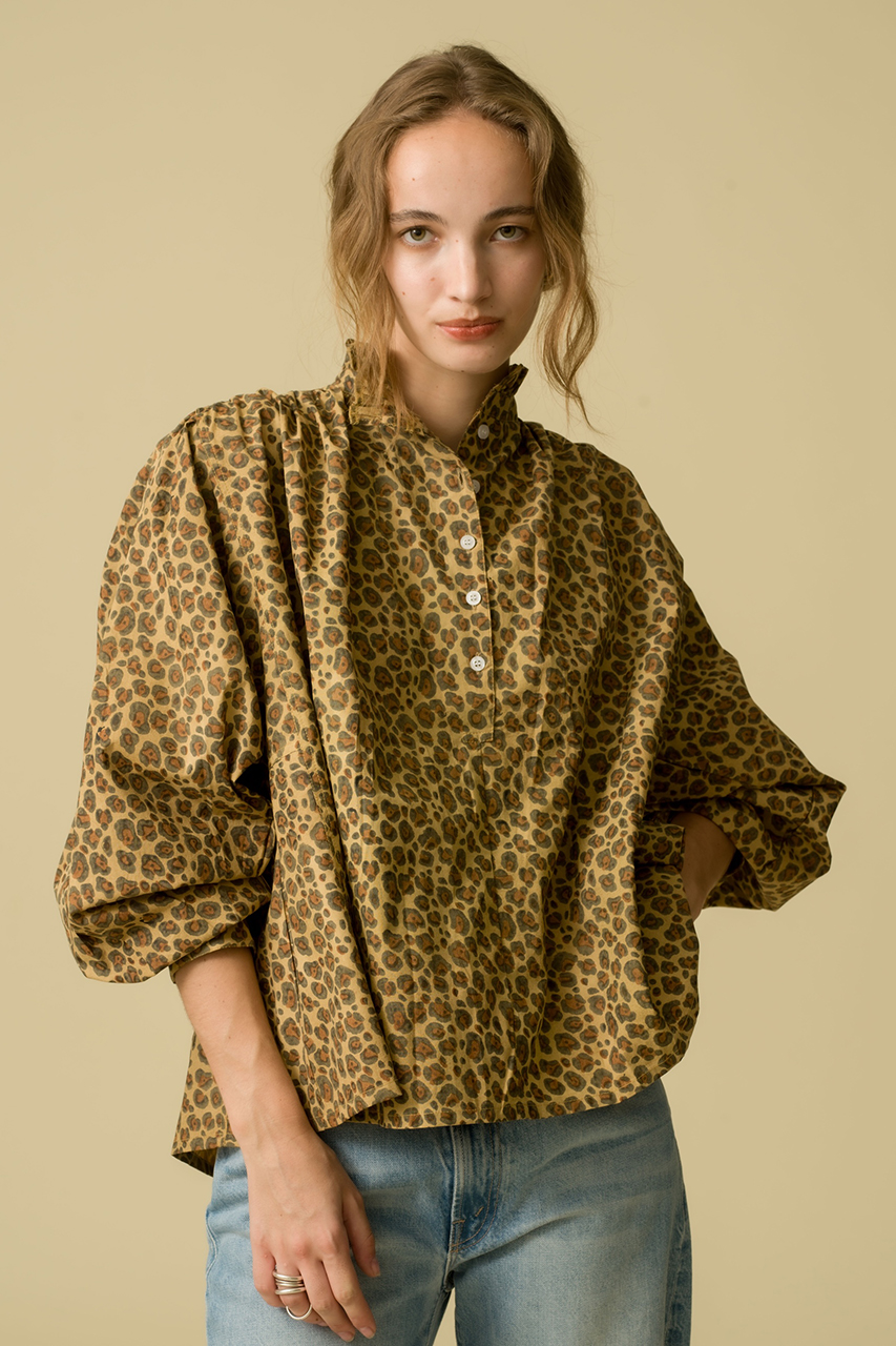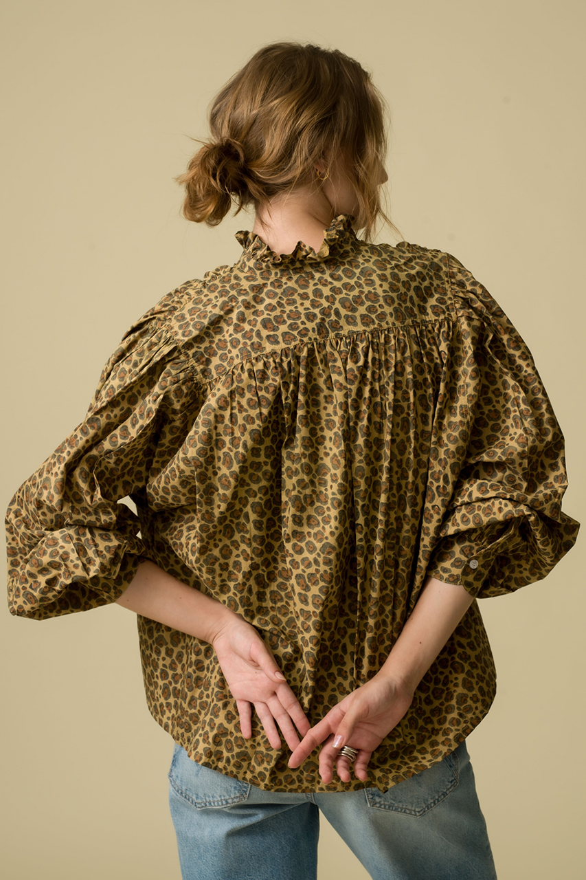 ギャザーを寄せたフリルネックのスタンドカラーが強くなり過ぎず、大人の可愛らしさを演出するブラウス。ゆったりとしたサイジングとボリュームスリーブが身体を包み込み、リラクシーな着心地が嬉しい一枚。デニムと合わせたデイリーな着こなしはもちろん、あえてきれいめスカートと合わせたお出かけスタイルにもトライして。