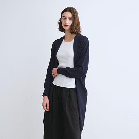 程よい光沢感のあるドライタッチな風合いで軽やかに仕上げたロングカーディガン。