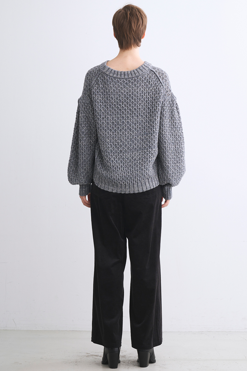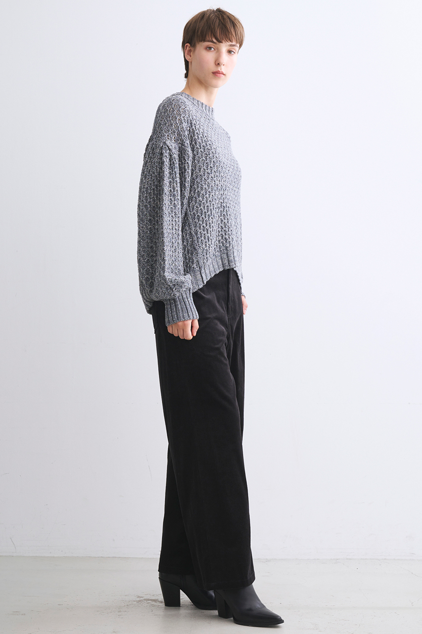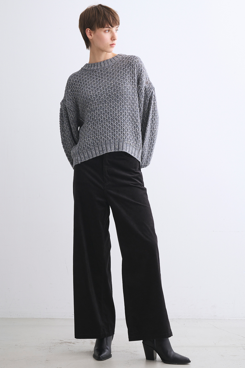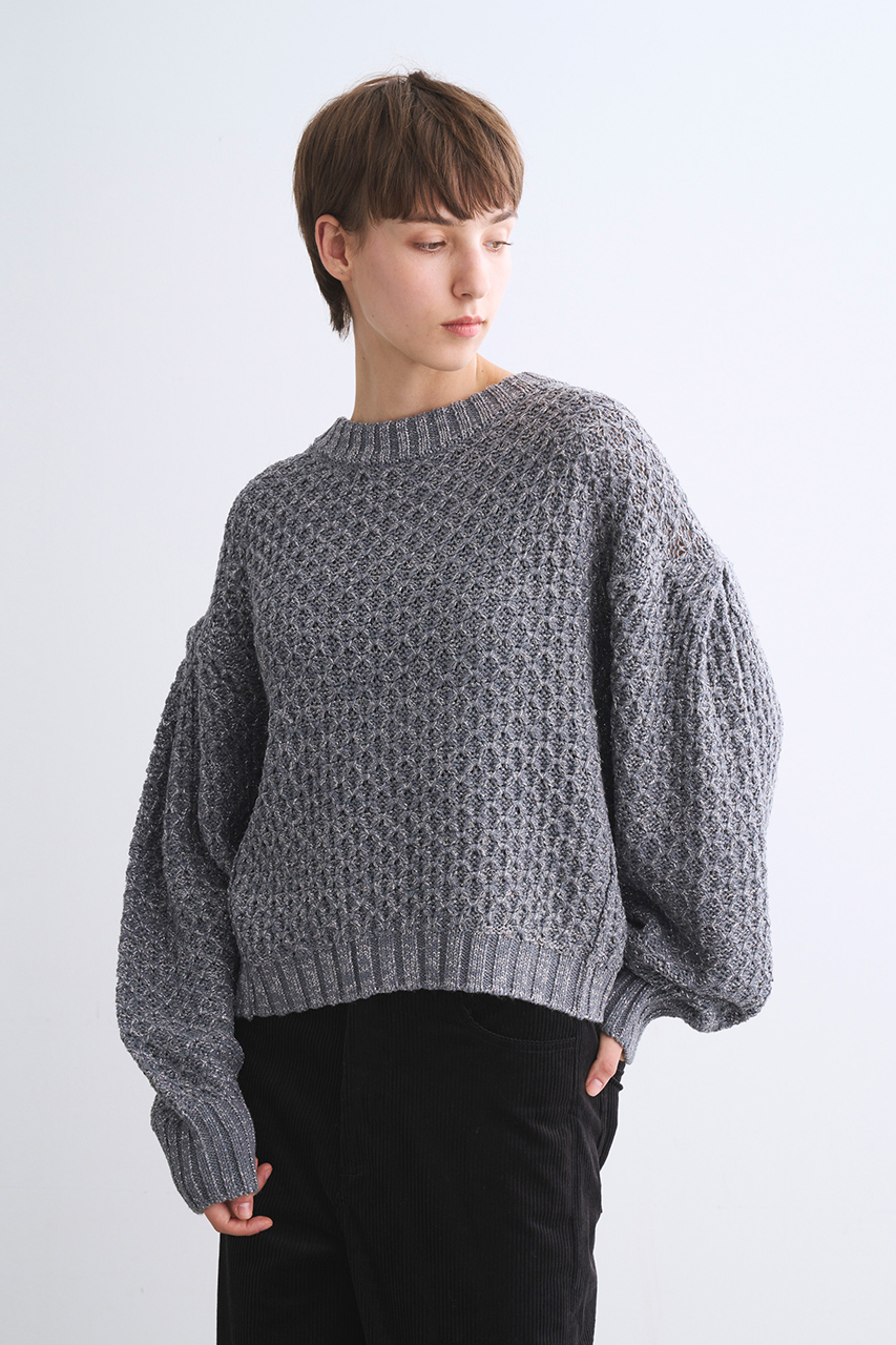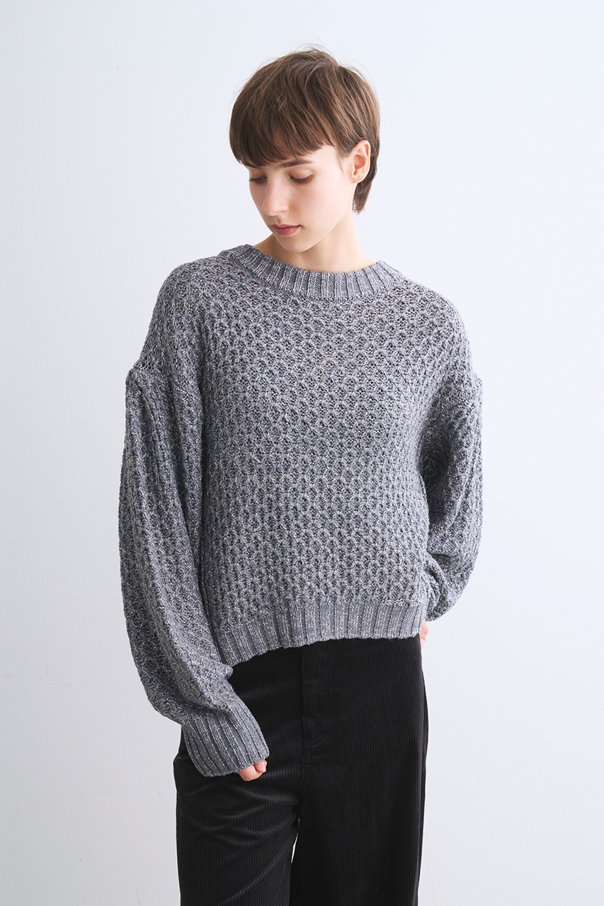 ラメ糸をミックスした光沢のあるメランジカラーのニットは、シーズンムードを高めてくれる一枚。