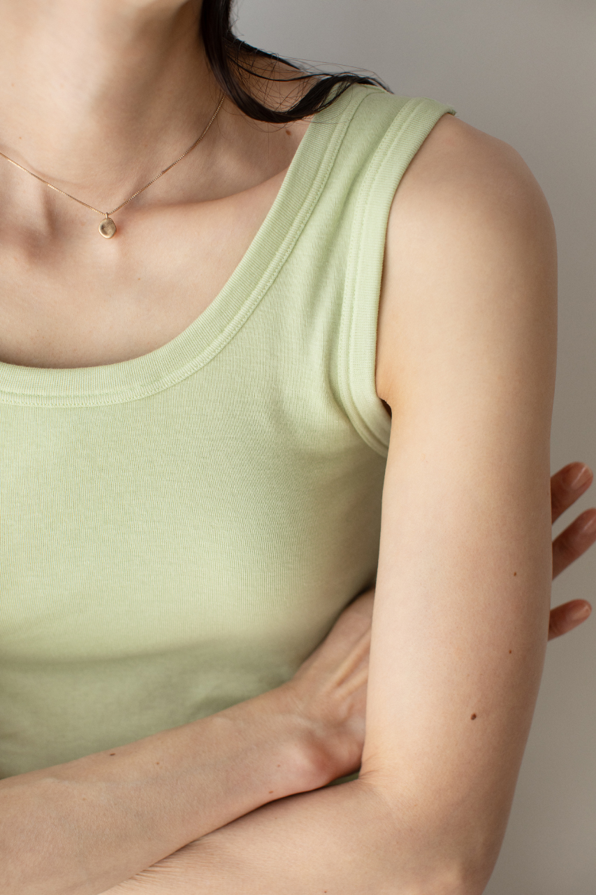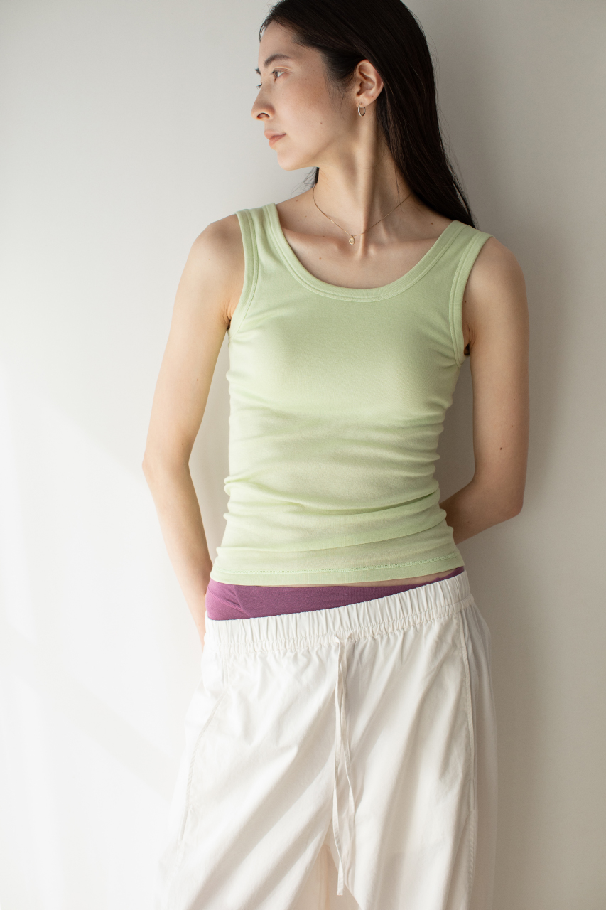 コットンシルクがふんわり心地好い、パッド付タンクトップ。