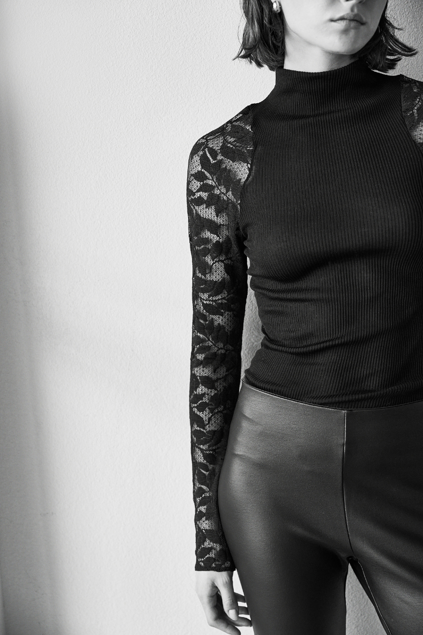 日常のラグジュアリーを象徴するのは、フランスの老舗「Sophie Hallette(ソフィ アレット)」のリバーレースを用いた総レースブラ&ショーツ。曲線的なカッティングでデコルテを美しく、ヒップのカットアウトで華やぎをプラス。ベージュのコットン天竺を重ね、やさしい肌あたりと繊細な柄を際立たせます。