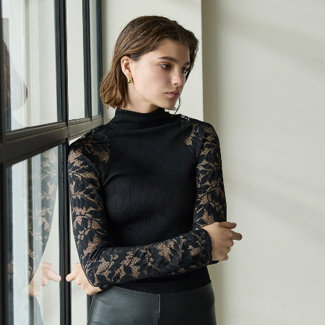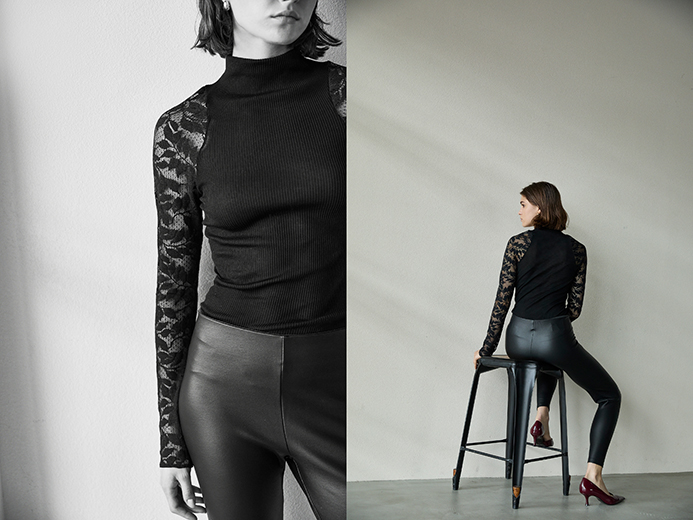 毎年人気の袖レースロングスリーブが、今季さらにブラッシュアップして登場。甘さを抑えたリーフ柄のレースは、フランスの老舗「Sophie Hallette(ソフィ アレット)」のリバーレースを使用。身生地にはコットン100%のリブを採用し、軽やかで快適な着心地に。アメリカンスリーブ切り替えとハイネックがシャープな印象を演出します。秋は一枚で、冬はレイヤードして、長いシーズン活躍します。