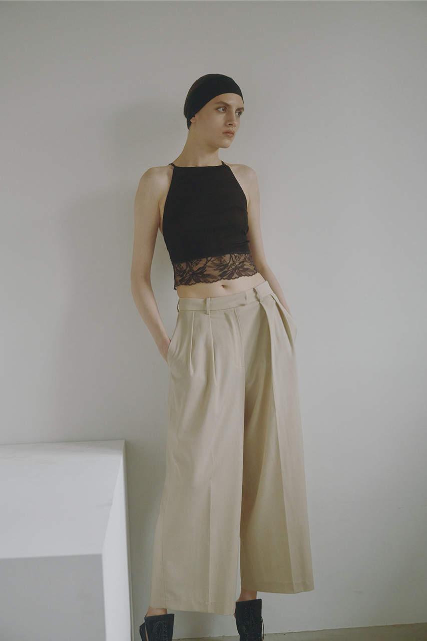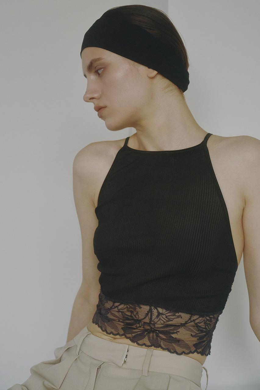 艶やかなシルクリブと繊細なリバーレースが描く、静かな存在感。アメリカンスリーブの潔いカッティングに、背中一面のレースが印象的なキャミ。クロップド丈で、ハイウエストボトムやジャケットとも好相性です。