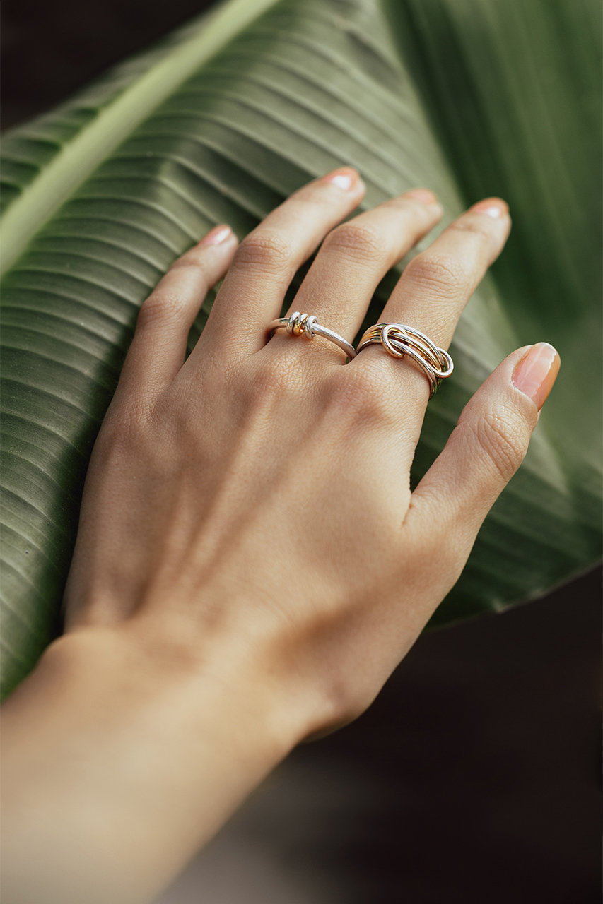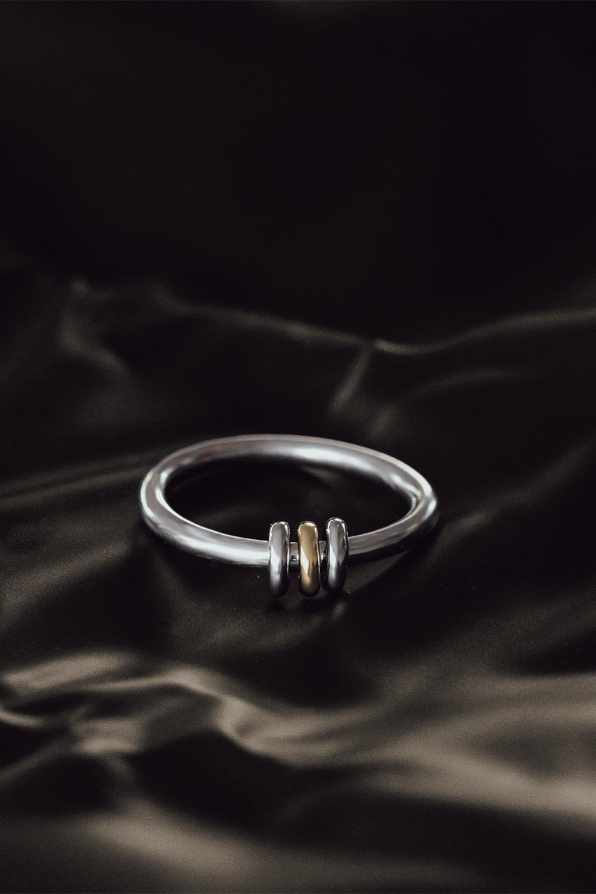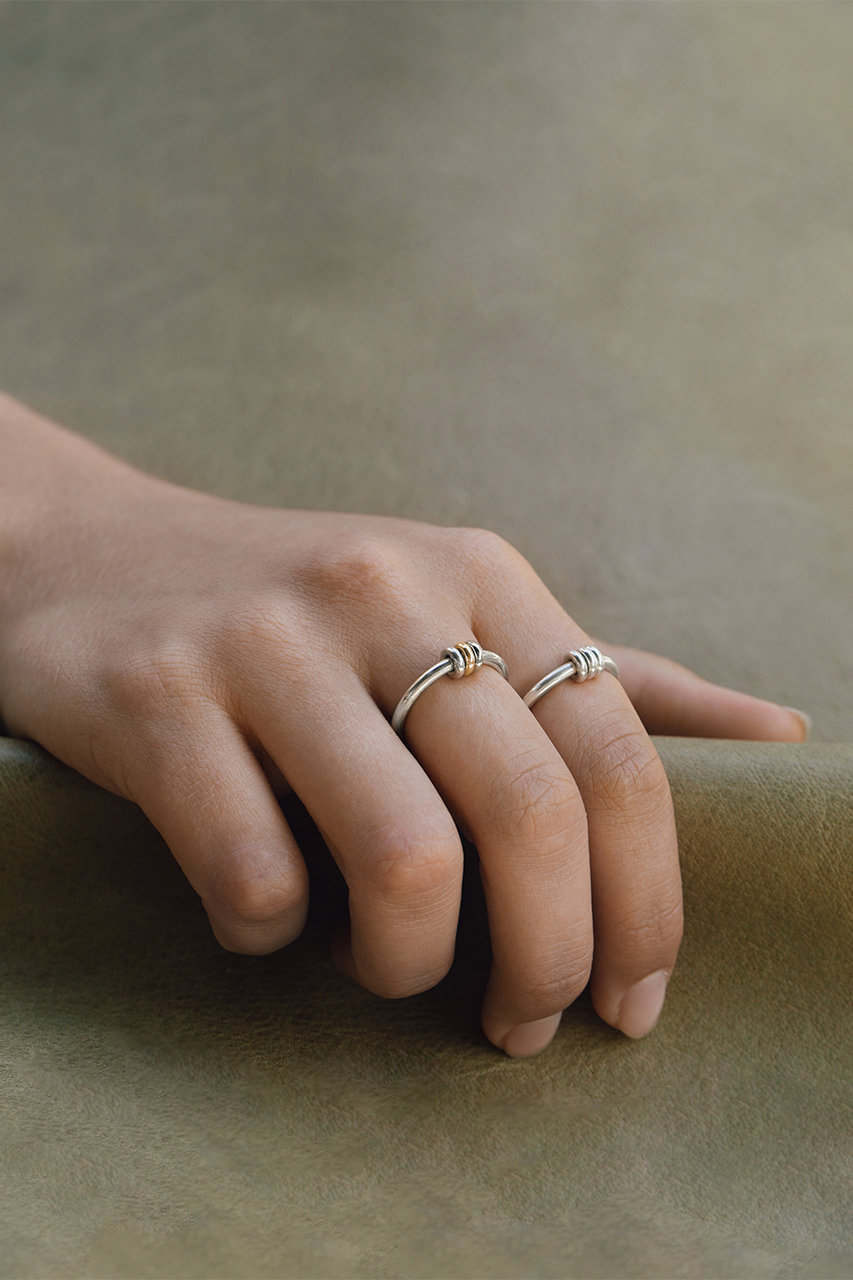 シンプルな一本のシルバーリングに小さなリング(アニュレット)が三つついたデザイン。手持ちのリングとも重ね付けしやすいのが人気No.1のポイント。さりげなく輝くゴールドがアクセントになっています。