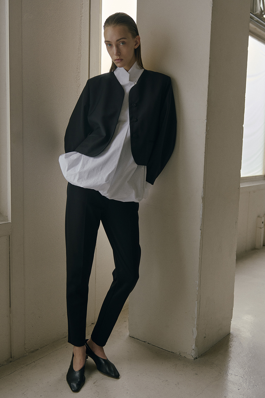 蕾のように膨らみを持たせたスリーブとのコントラストが印象的なノーカラージャケット。
