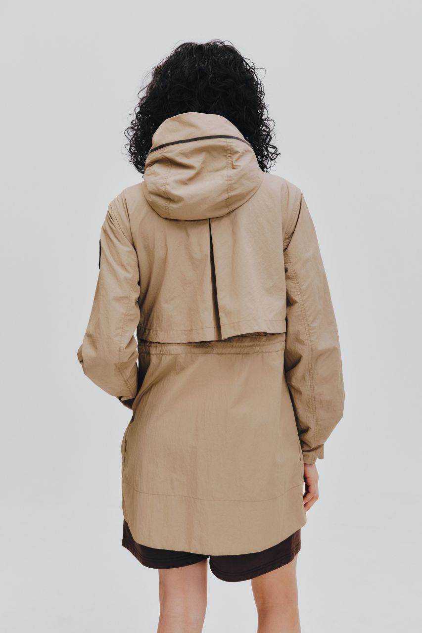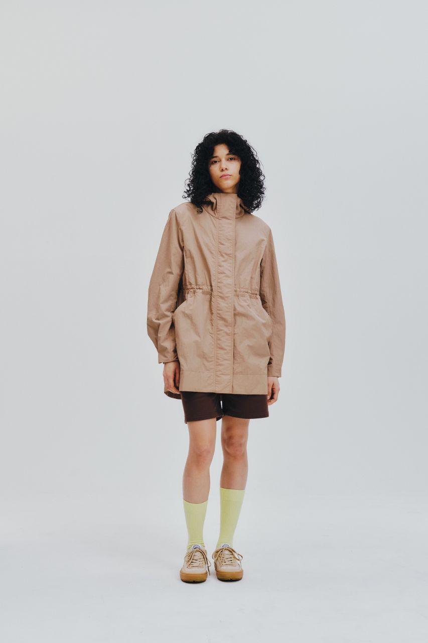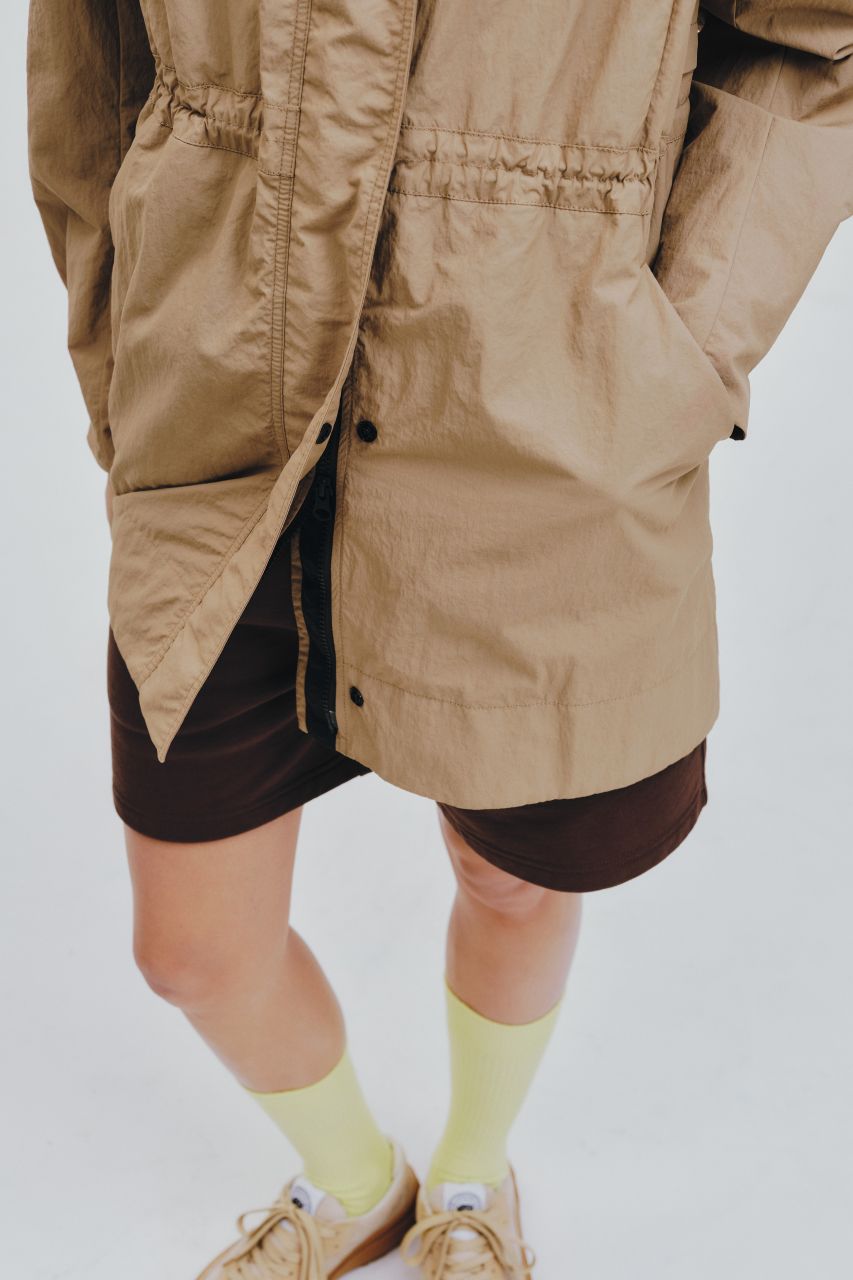 パッと目を惹くアズライトブルーが着映えを叶えます。本格的なタクティカルデザインをモダンなシルエットにアレンジ。中綿なしなので軽やかに羽織れて、シャツやニットとのレイヤードももたつかず、寒暖差の大きい時期に重宝します。内側のドローコードでウエストにメリハリをつけても素敵。ワイヤー入りのフードや多彩なポケットなど、テック感のある機能派ディテールで春の着こなしをアップデートして。