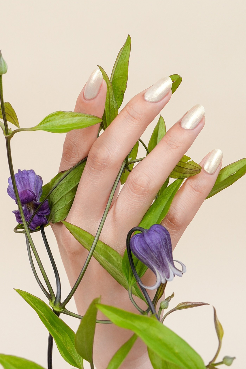 秋の陽射しを思わせる、やわらかなホワイトベースに繊細なゴールドラメを散りばめた幻想的なカラー。
