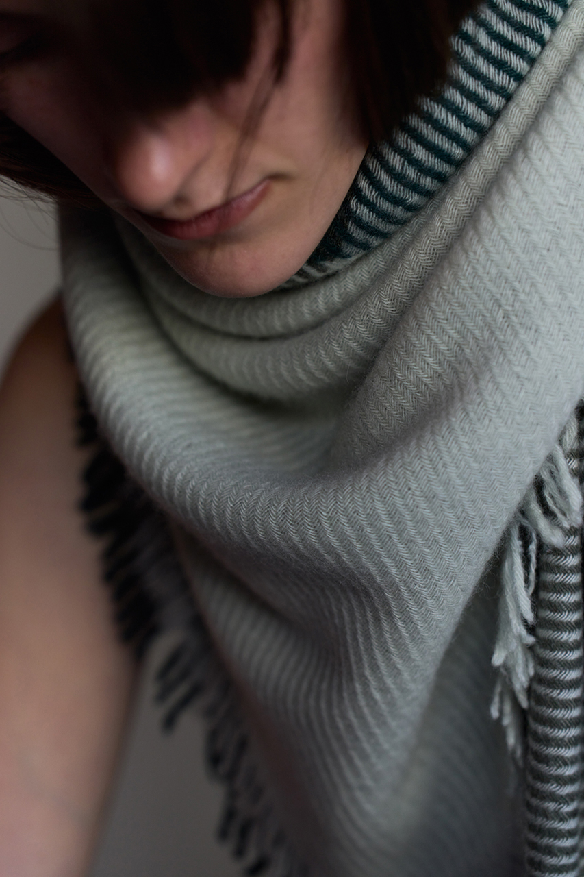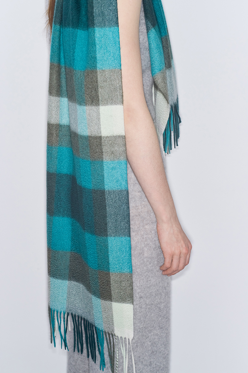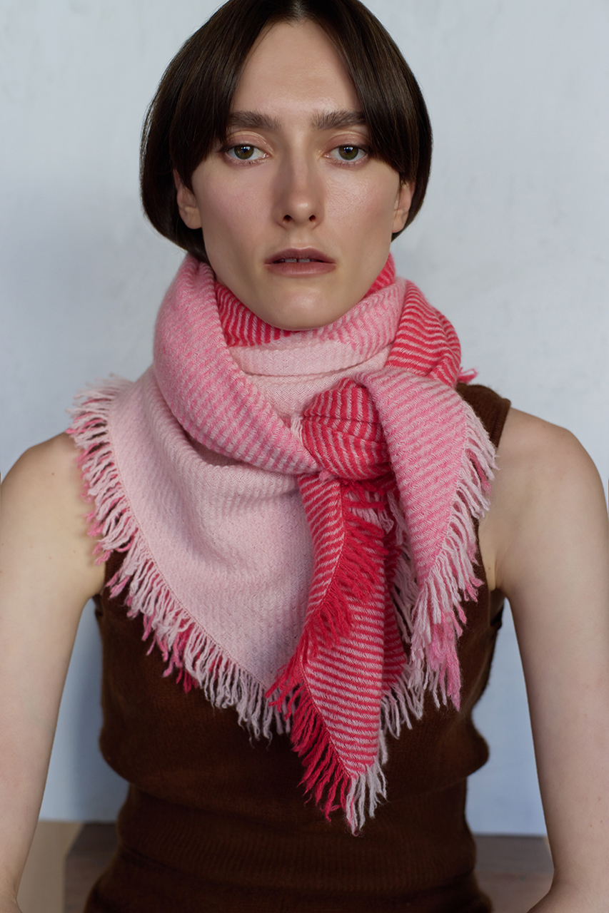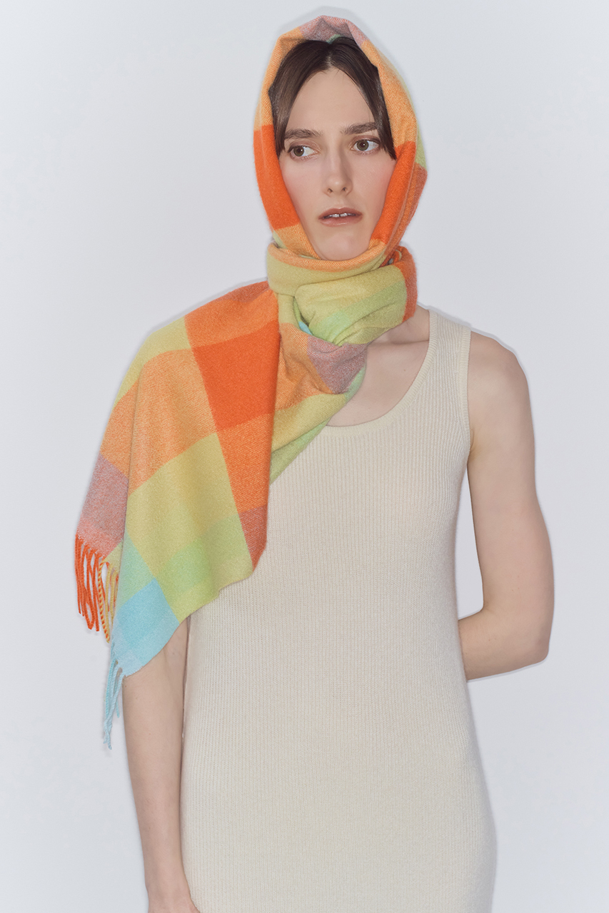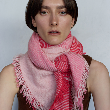 上質な原料ならではの美しい発色と、表面に浮かぶ繊細なウェーブが魅力のストール。落ち着いたカラーのアウターにひと巻きするだけで、シーズンらしい華やぎをプラス。ヨゼフ・アルバースの抽象画を思わせるカラーパネルが、冬の装いにモダンな表情を添えます。