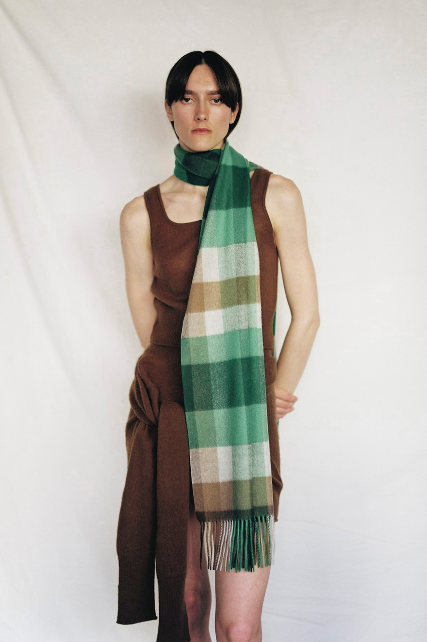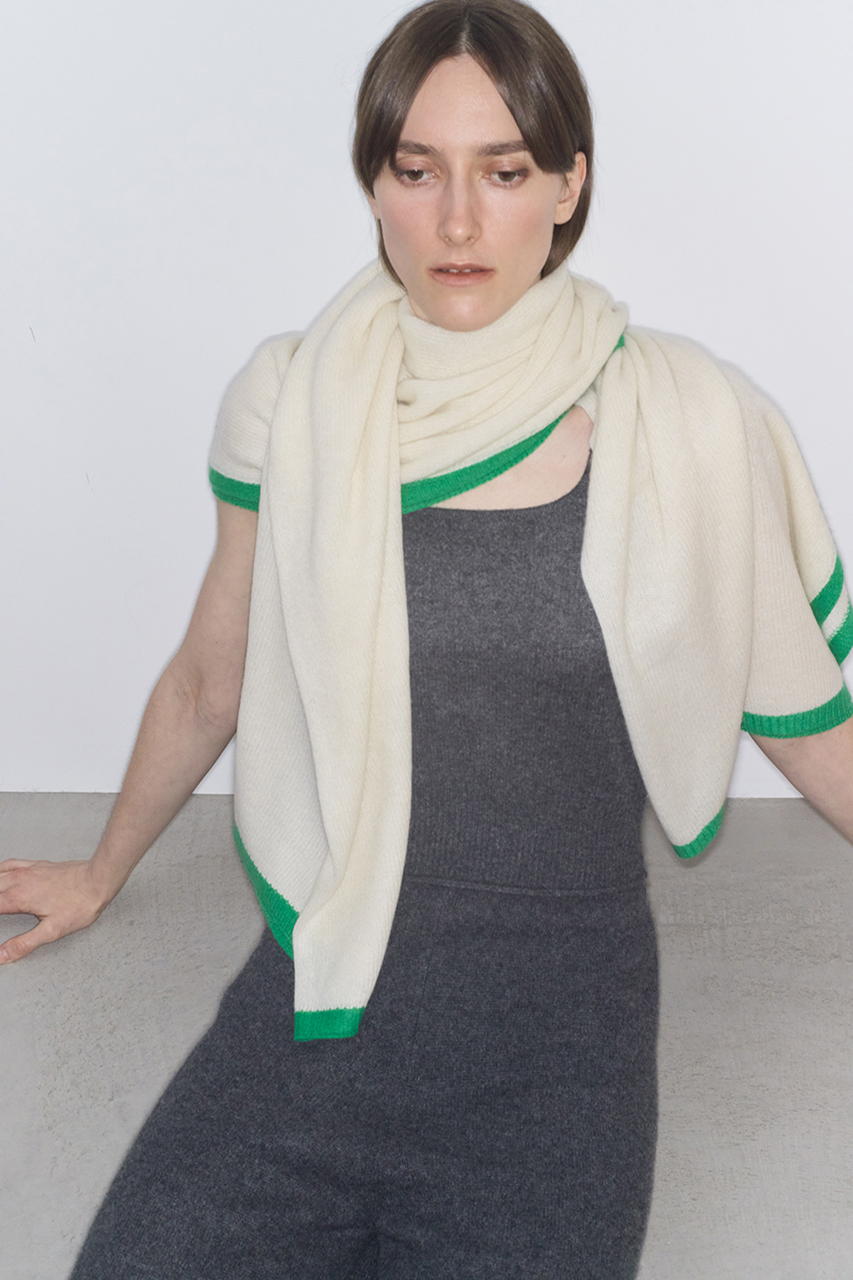 柔らかなカシミヤに映し出された色彩は、まるでアートピースの断片を纏うかのよう。シンプルなスタイルに重ねるだけで奥行きが生まれ、日常の装いを特別な存在へと引き上げます。