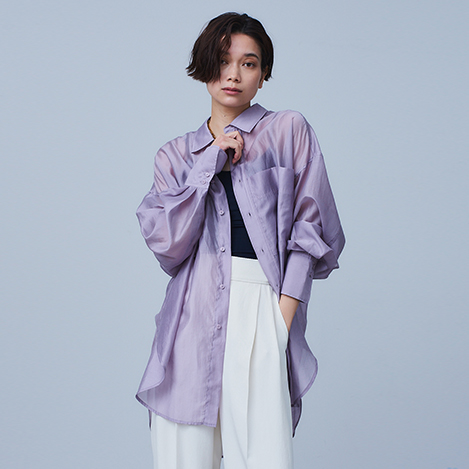 ロング丈で鮮度のある、大人のシアーシャツ。ほどよい透け感と上品な光沢感が特徴のソフトなオーガンジー素材を使用しました。