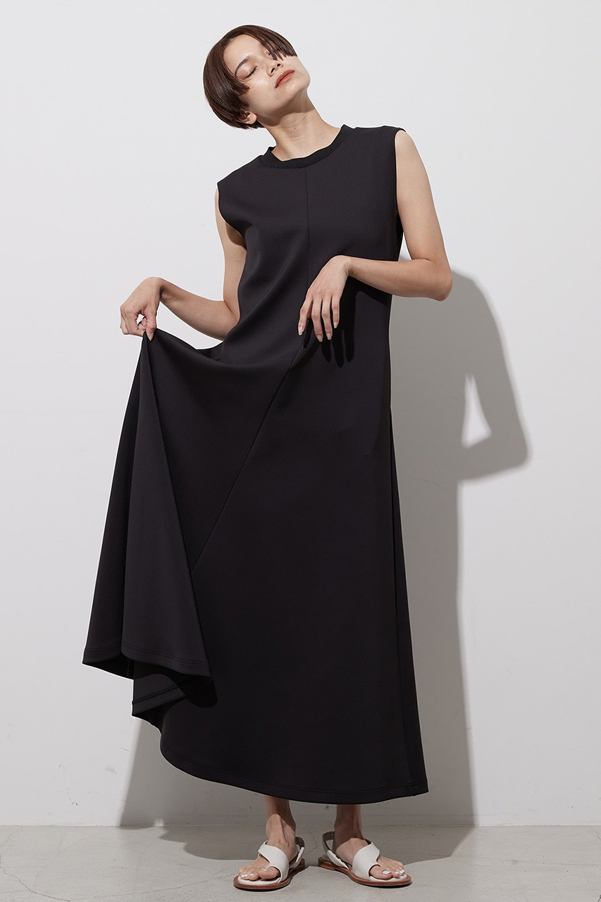 同素材のフォルムが美しいジャージワンピース。たっぷりとしたフレアシルエットが上品さを演出するアイテム。