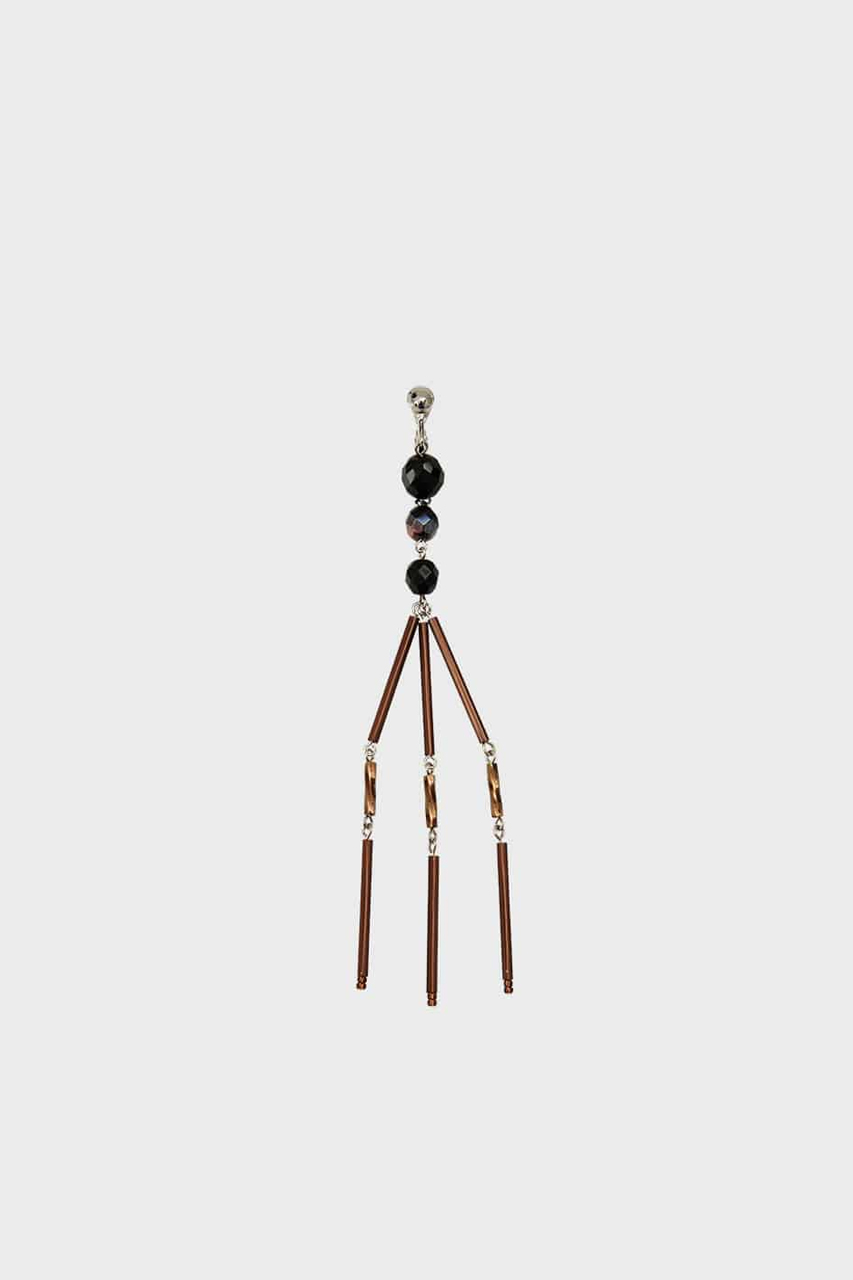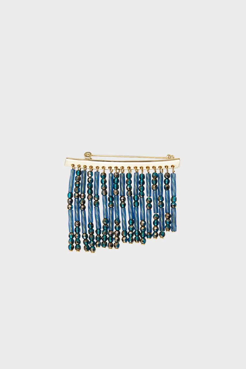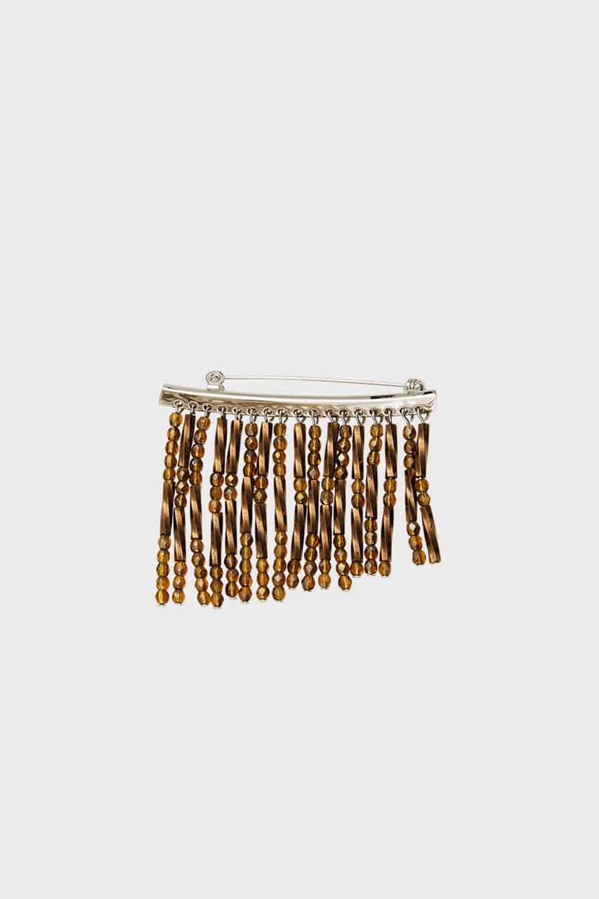 有機的な流れが美しい地金から水が滴るようなビーズが連なるブローチ。フリンジのような躍動感のあるディティールがモードな印象を与えます。