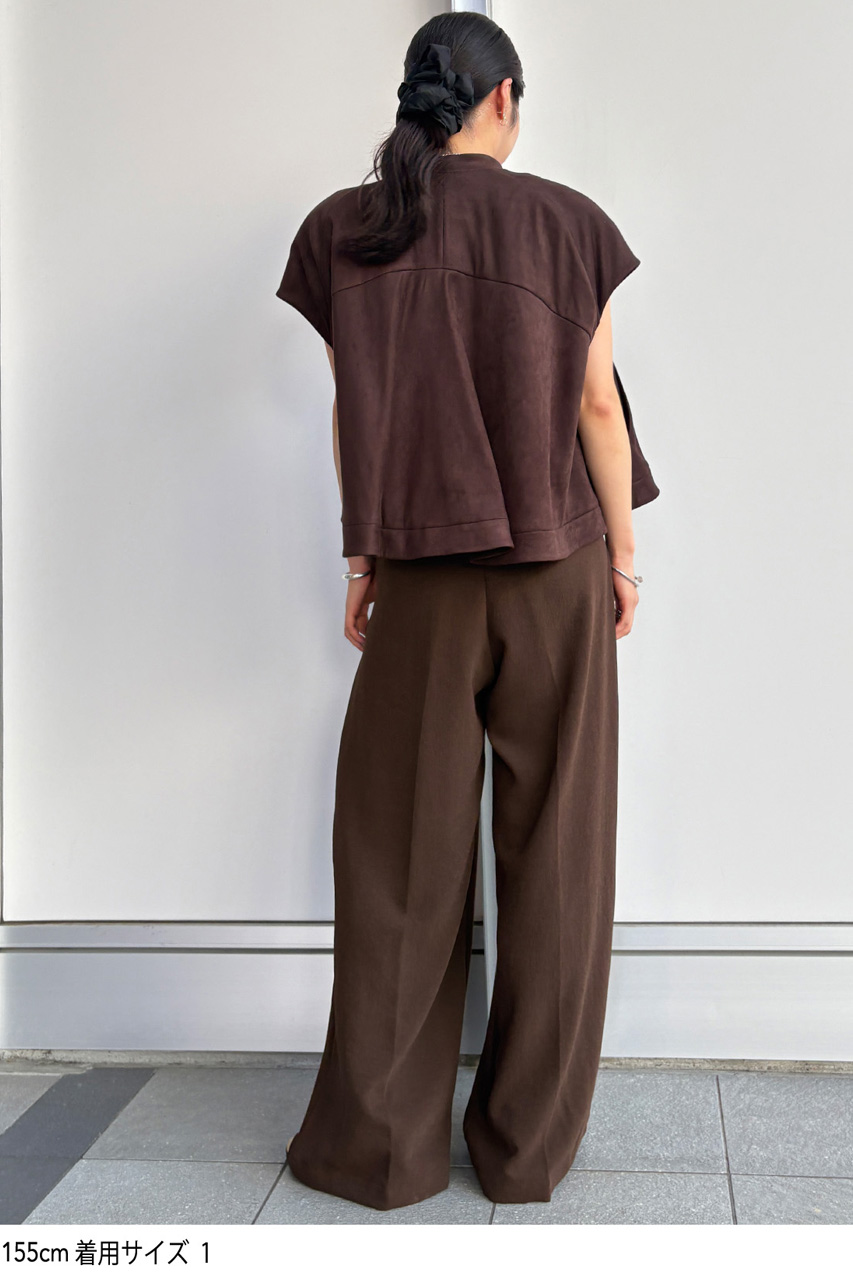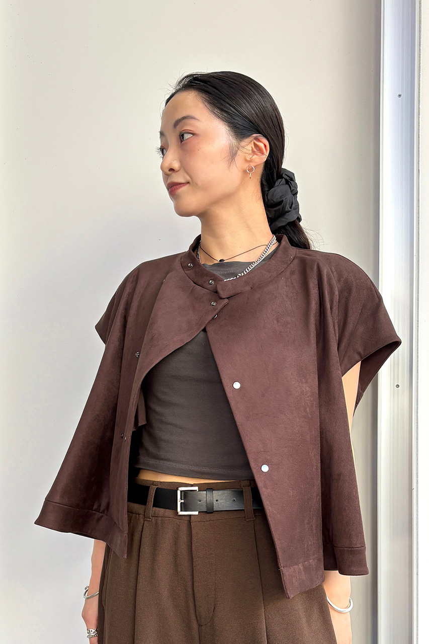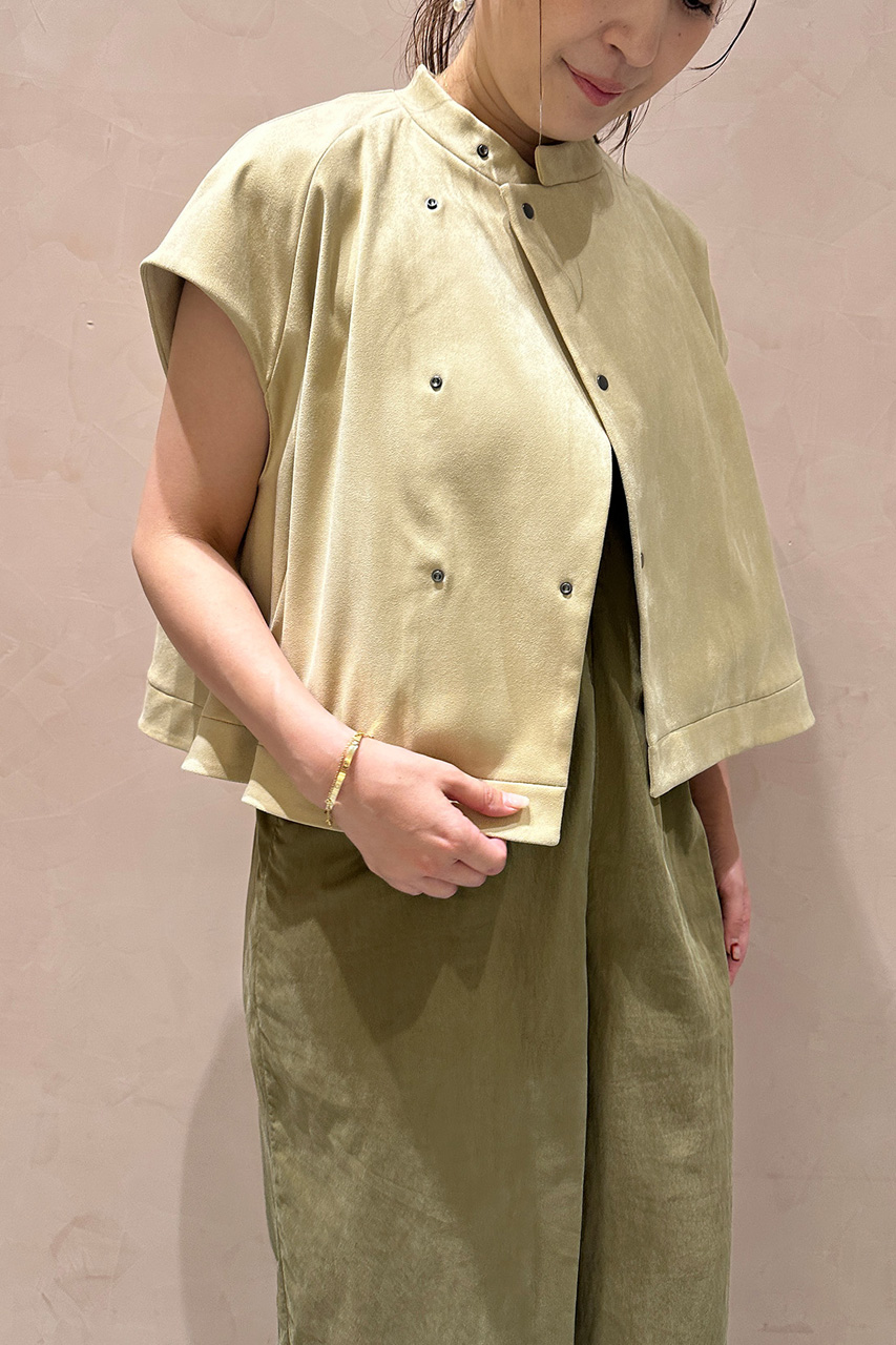 滑らかで肌なじみの良いフェイクスエード素材を使用したAラインジャケット。 控えめなドットボタンとミニマルなネックラインが上品な印象を与え、バックドレープが立体的で女性らしいシルエットを生み出します。肩まわりがゆったりとしているため、厚みのあるトップスをレイヤードしても快適に着ていただけます。