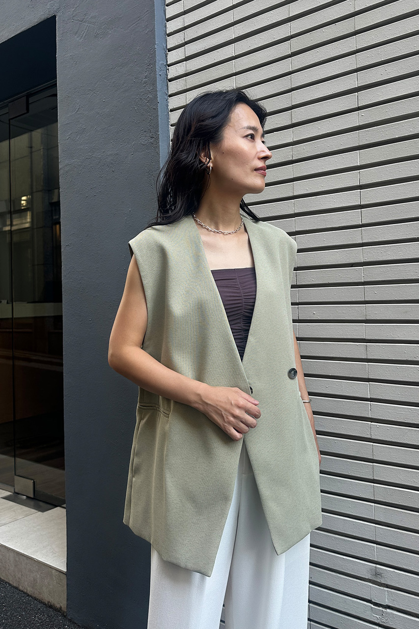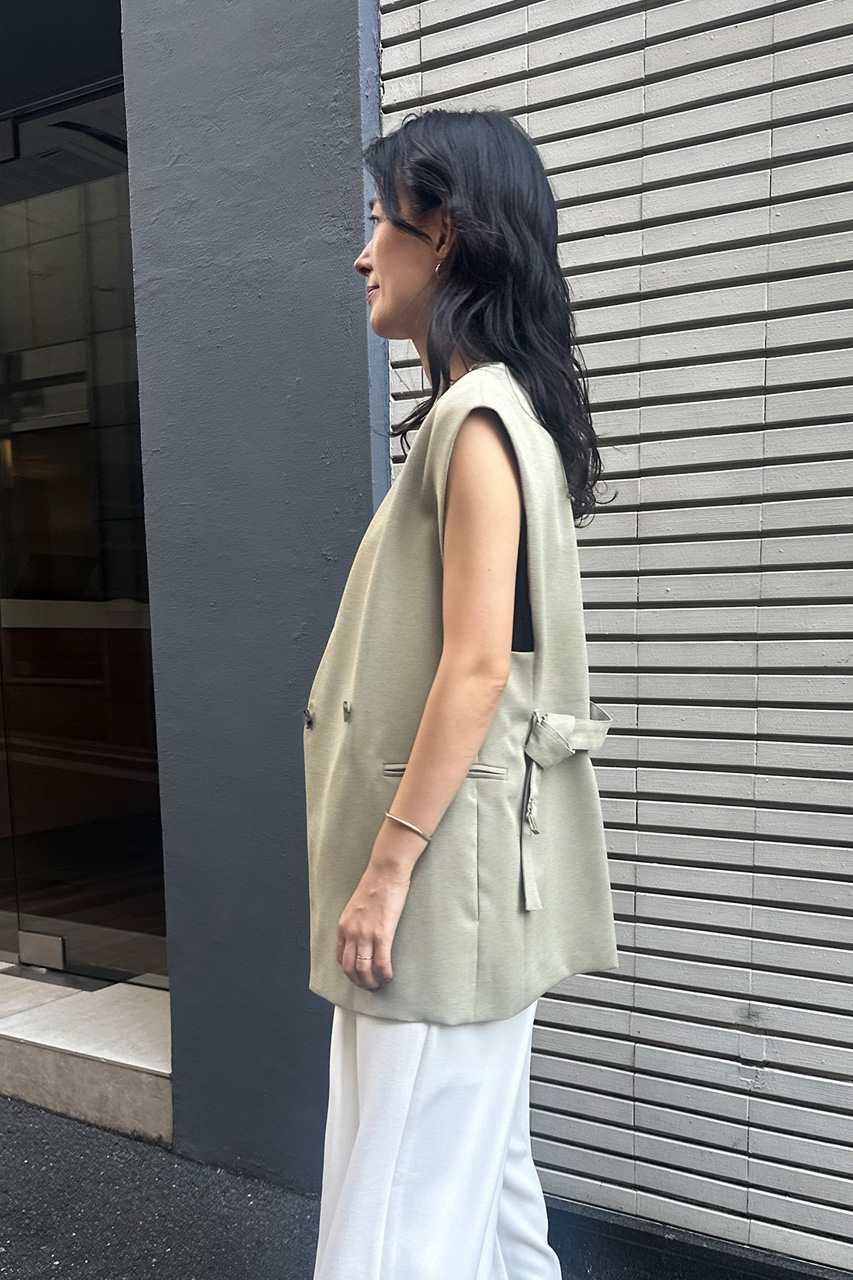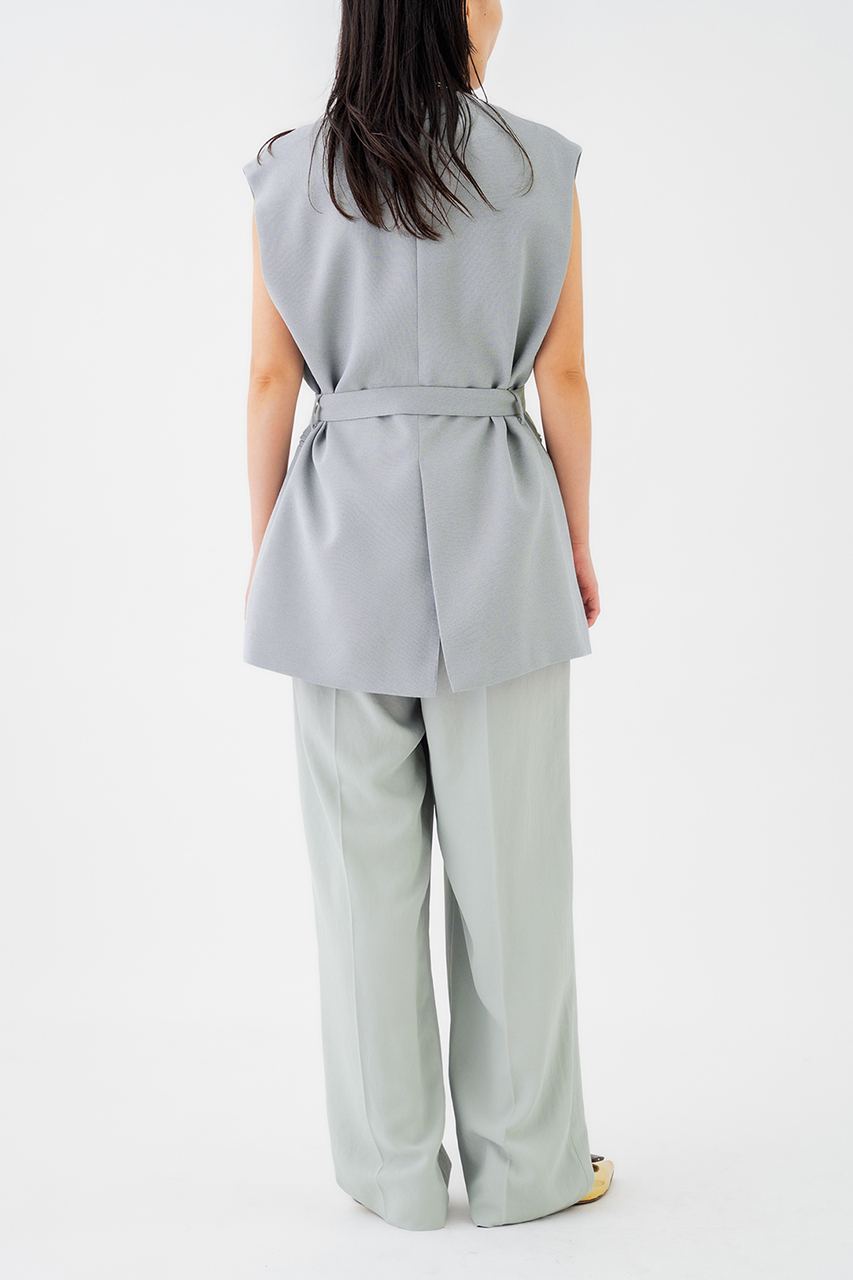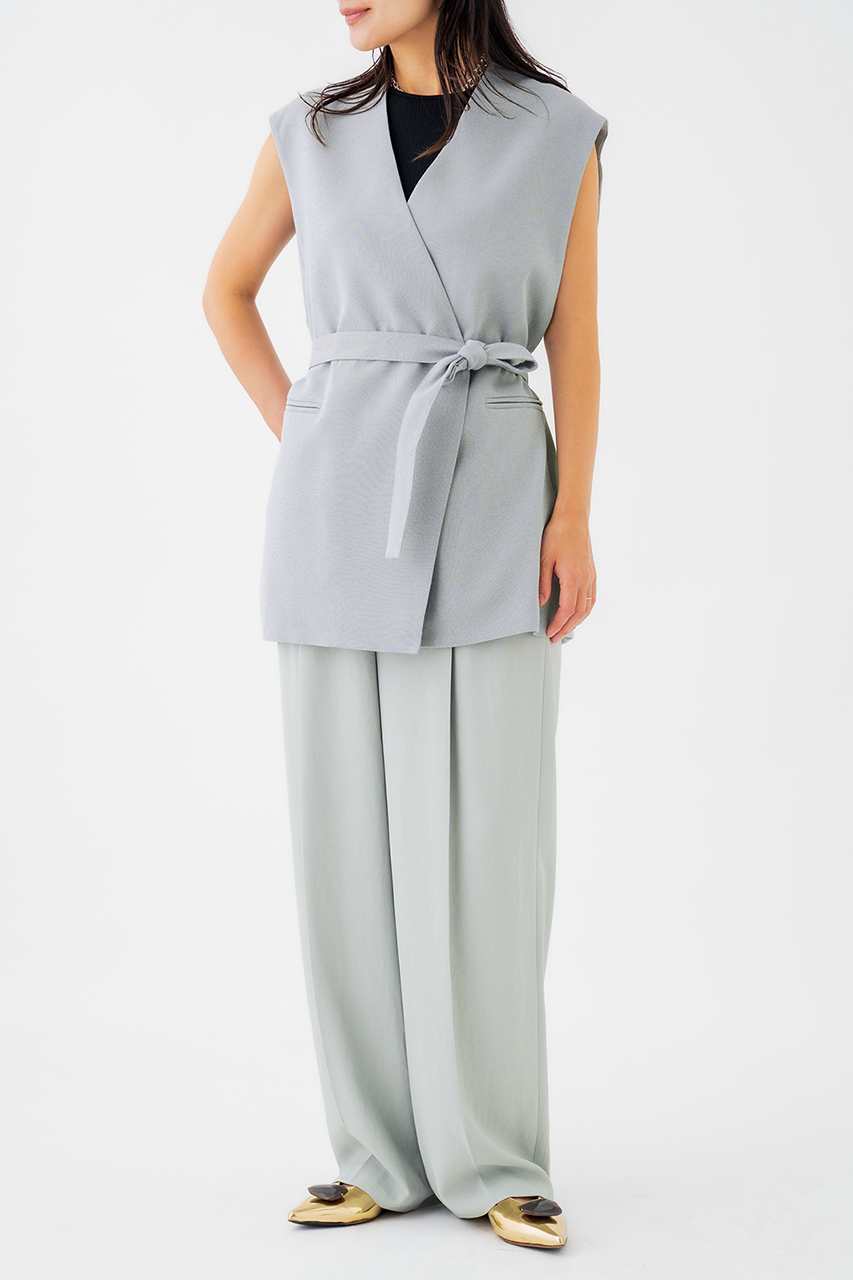 羽織るだけでサマになるシャープなカラーレスベスト。共布のベルトが一体となったデザインでミニマルな印象を与えます。ベルトを開けてリラックスしたスタイルでも、閉じてきちんと着こなしても、ショルダーラインがすっきり美しく決まるのが魅力。