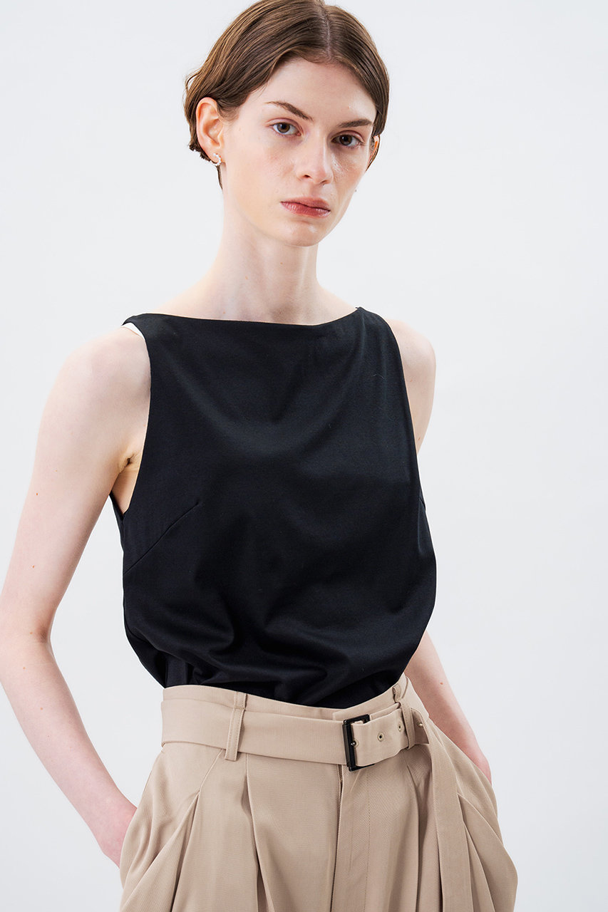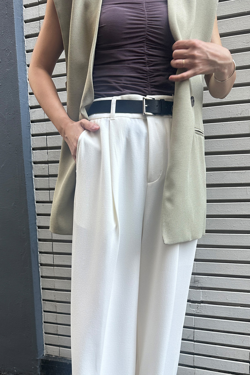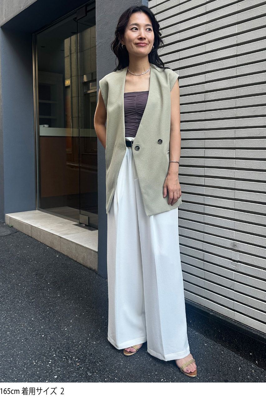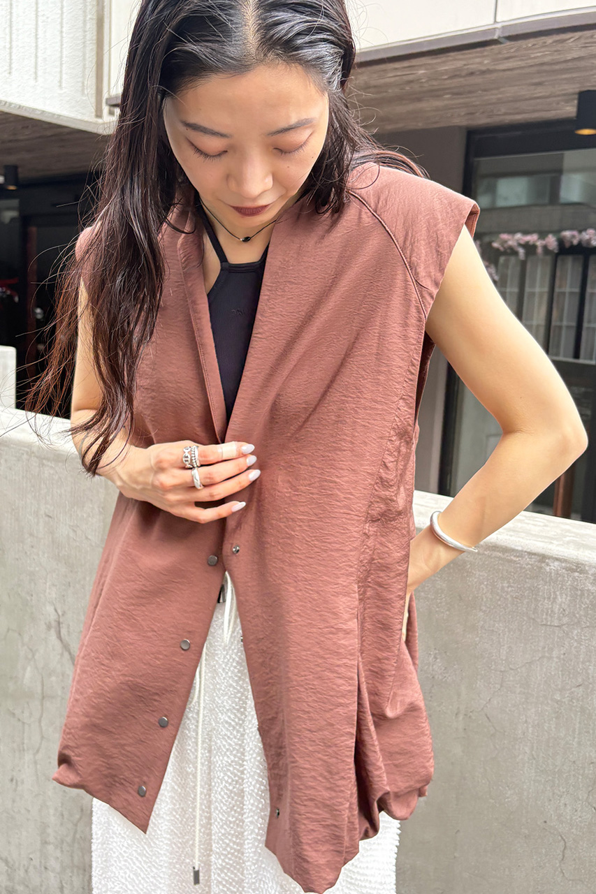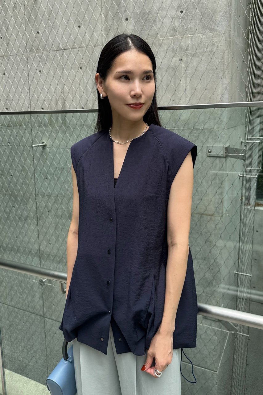 羽織るだけでサマになるシャープなカラーレスベスト。共布のベルトが一体となったデザインでミニマルな印象を与えます。ベルトを開けてリラックスしたスタイルでも、閉じてきちんと着こなしても、ショルダーラインがすっきり美しく決まるのが魅力。