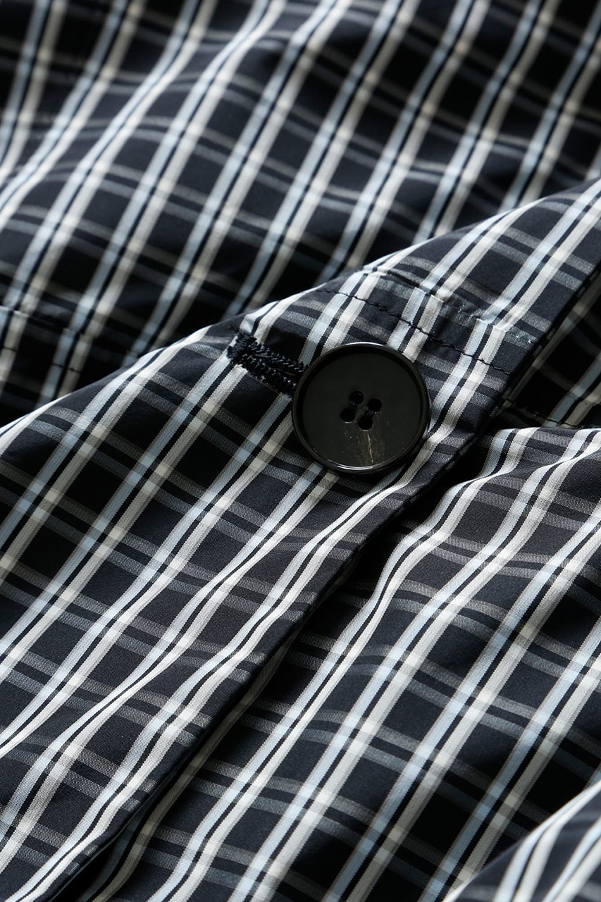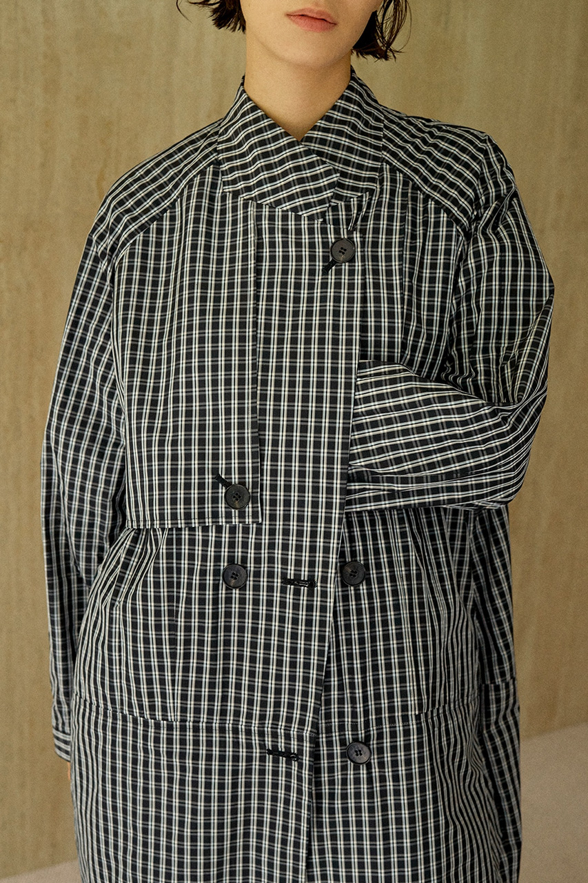 モダンなカラーリングで仕立てたギンガムチェックコート。クラシックなムードのコクーンシルエットをベースに、意図的に大きく設計したガンフラップや大胆なボタン配置がモダンな空気を添えています。
