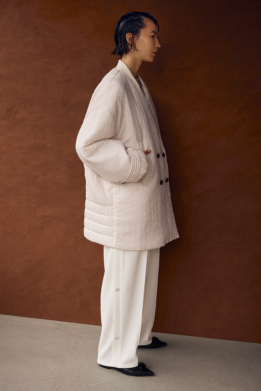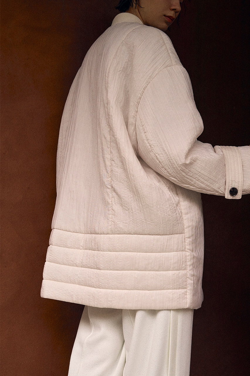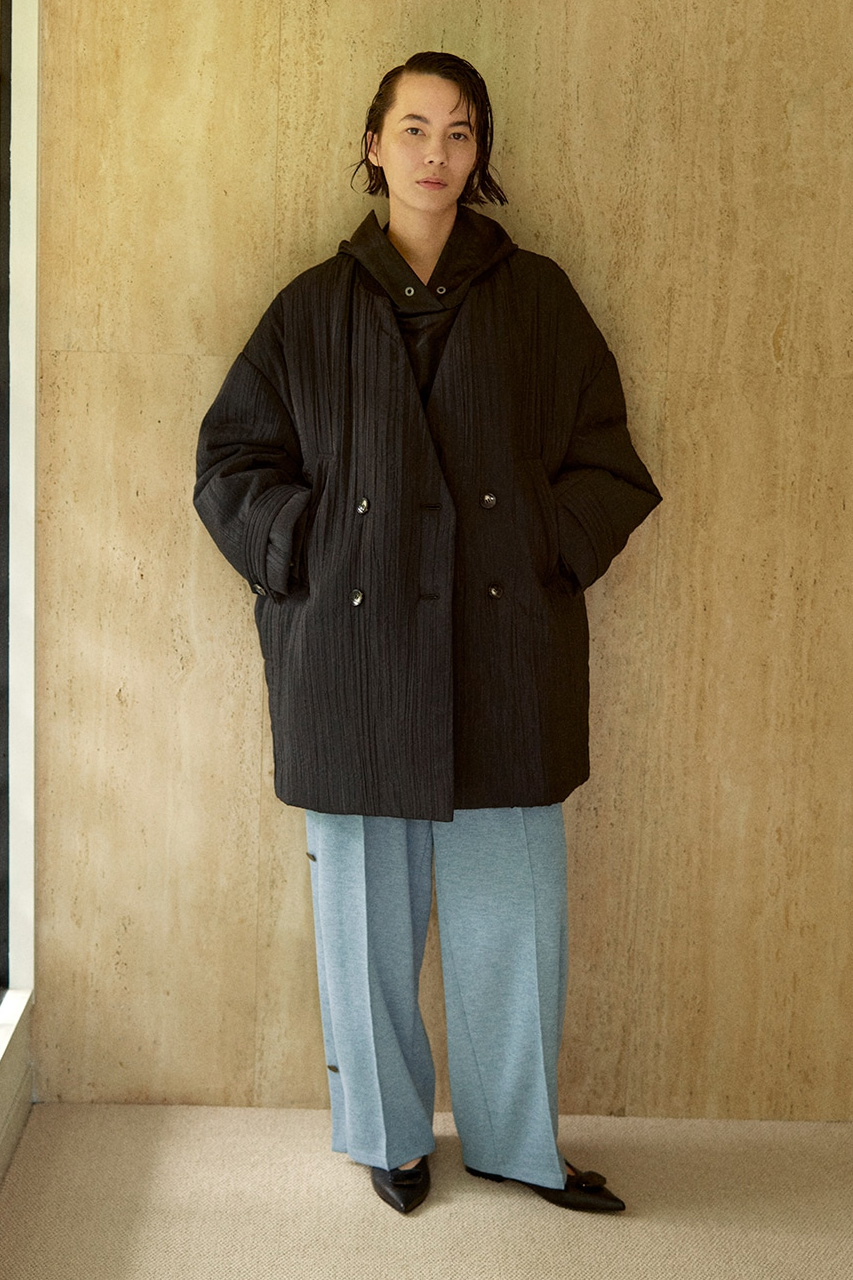 シルエットはあえてミニマルに仕立て、素材の魅力を際立たせるとともに、幅広いスタイリングに対応できる汎用性を持たせています。暗くなりがちな冬のスタイリングに、静かな華やぎをもたらす一着です。