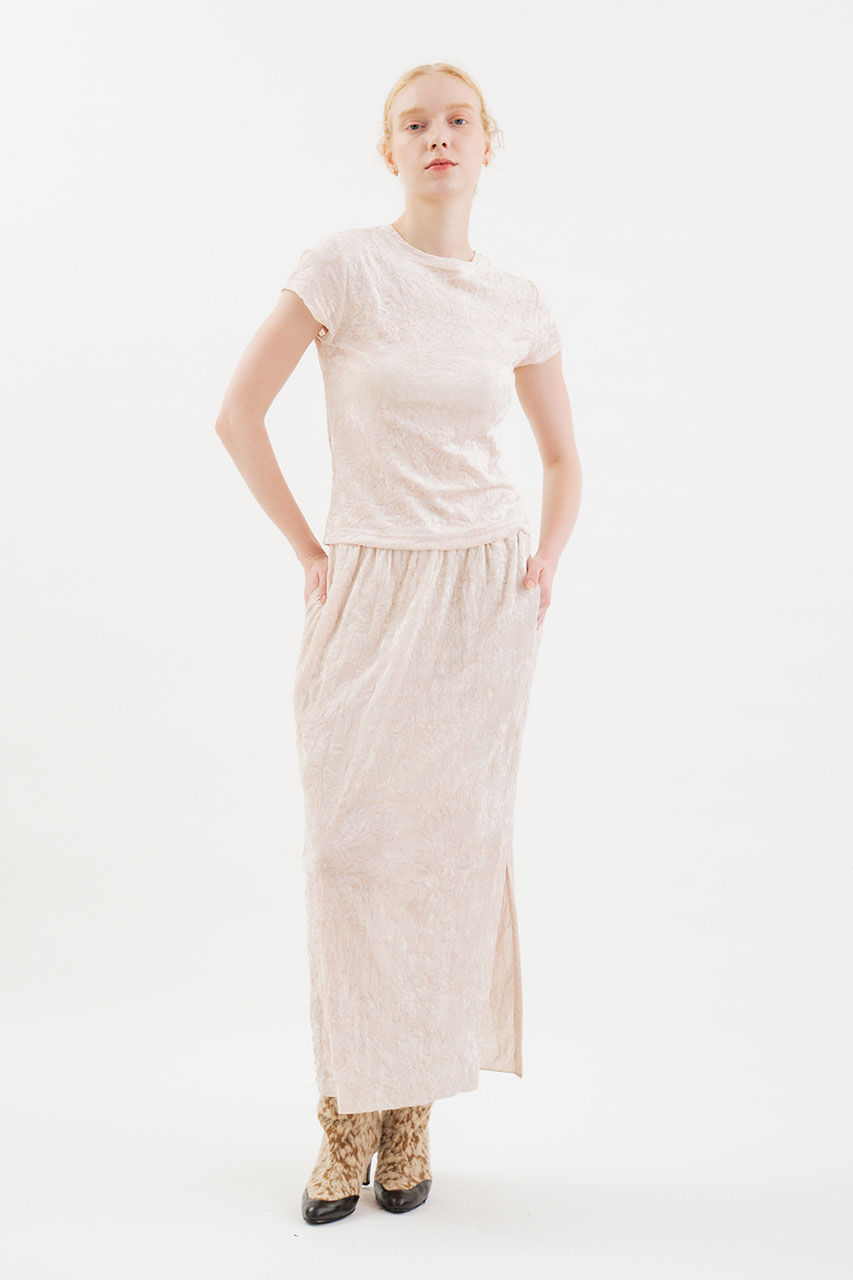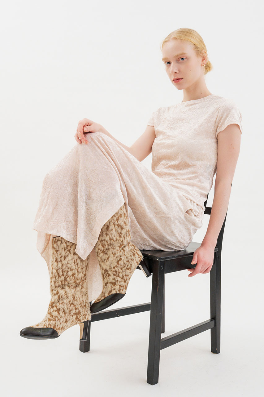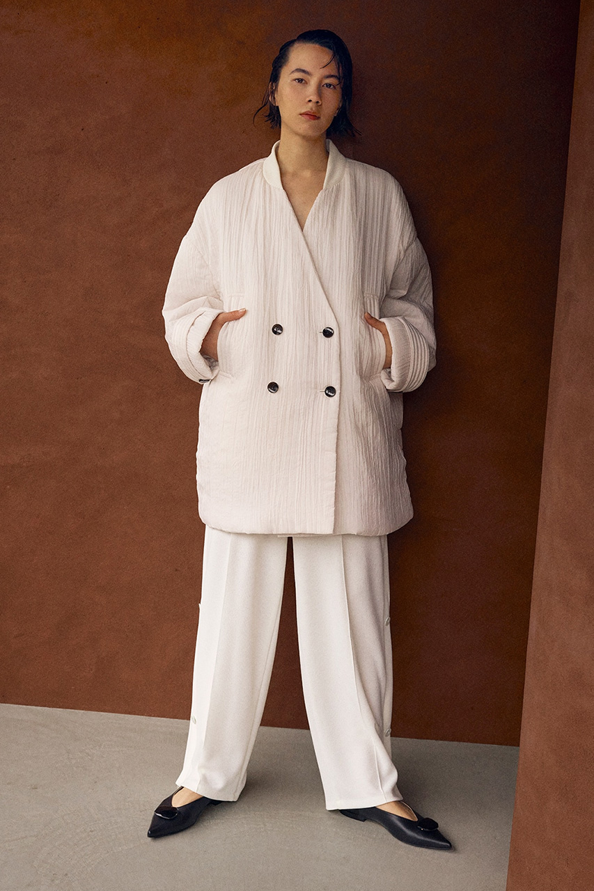 シルエットはあえてミニマルに仕立て、素材の魅力を際立たせるとともに、幅広いスタイリングに対応できる汎用性を持たせています。暗くなりがちな冬のスタイリングに、静かな華やぎをもたらす一着です。