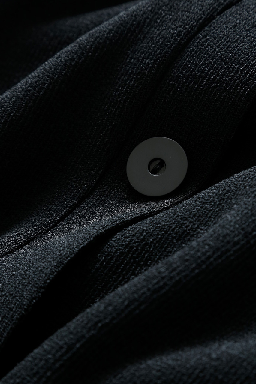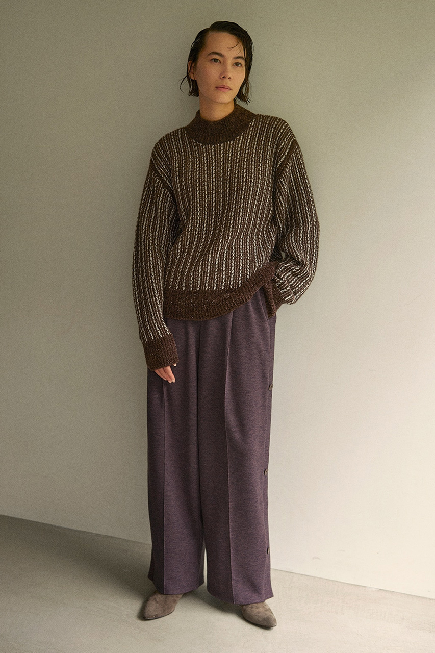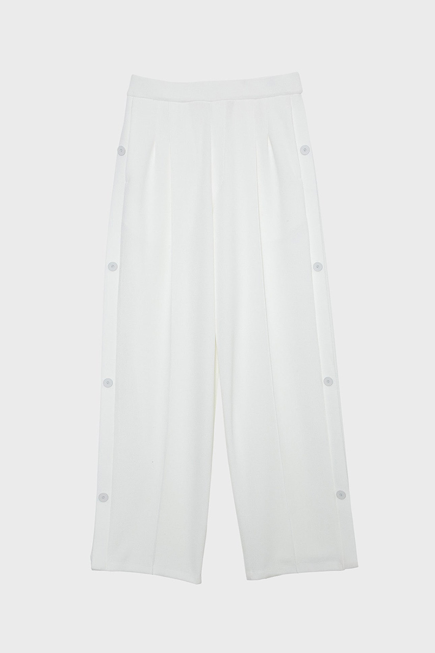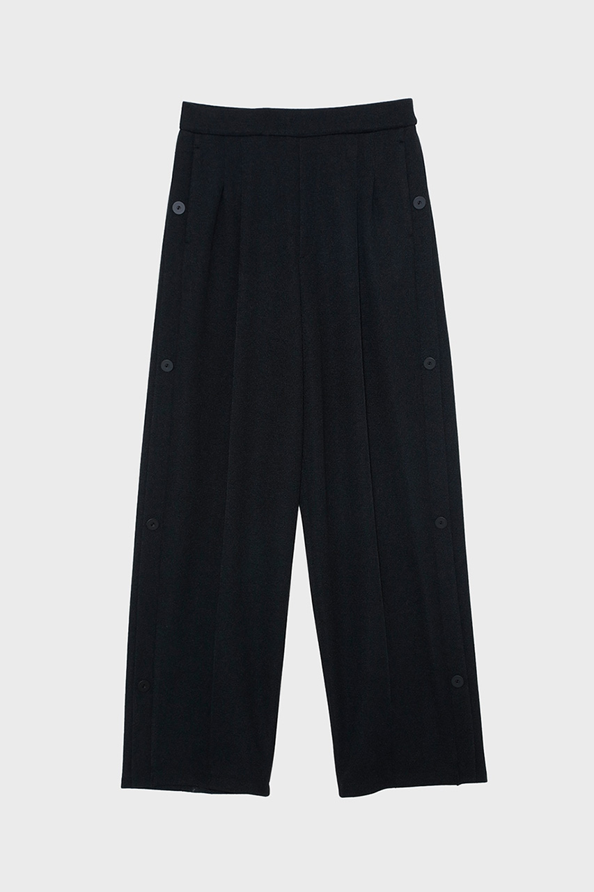 落ち感のあるジャージー素材パンツ。サイドに縦のラインを強調するディテールとボタンを配し、脚のラインをすっきりと見せつつ、さりげない個性を加えています。