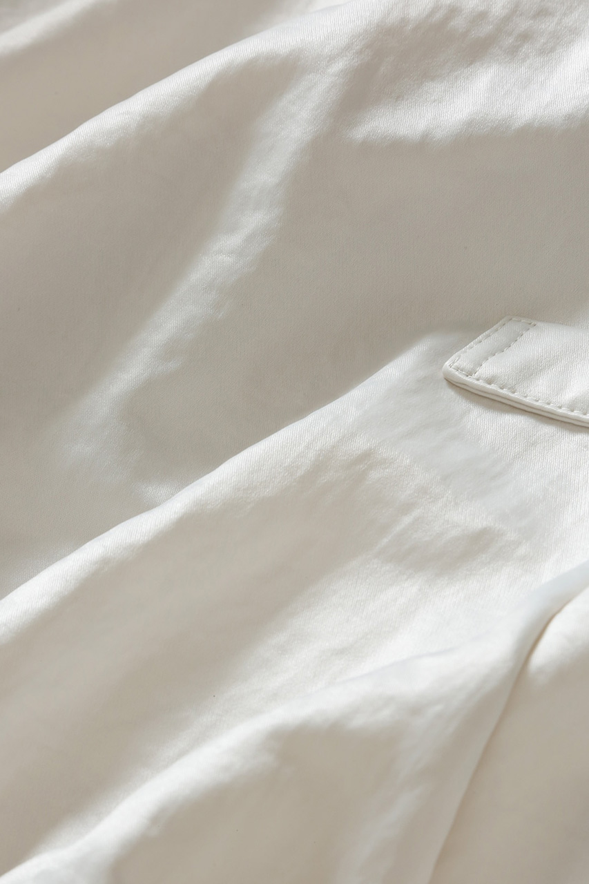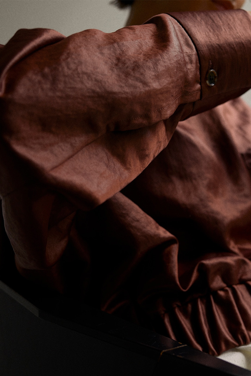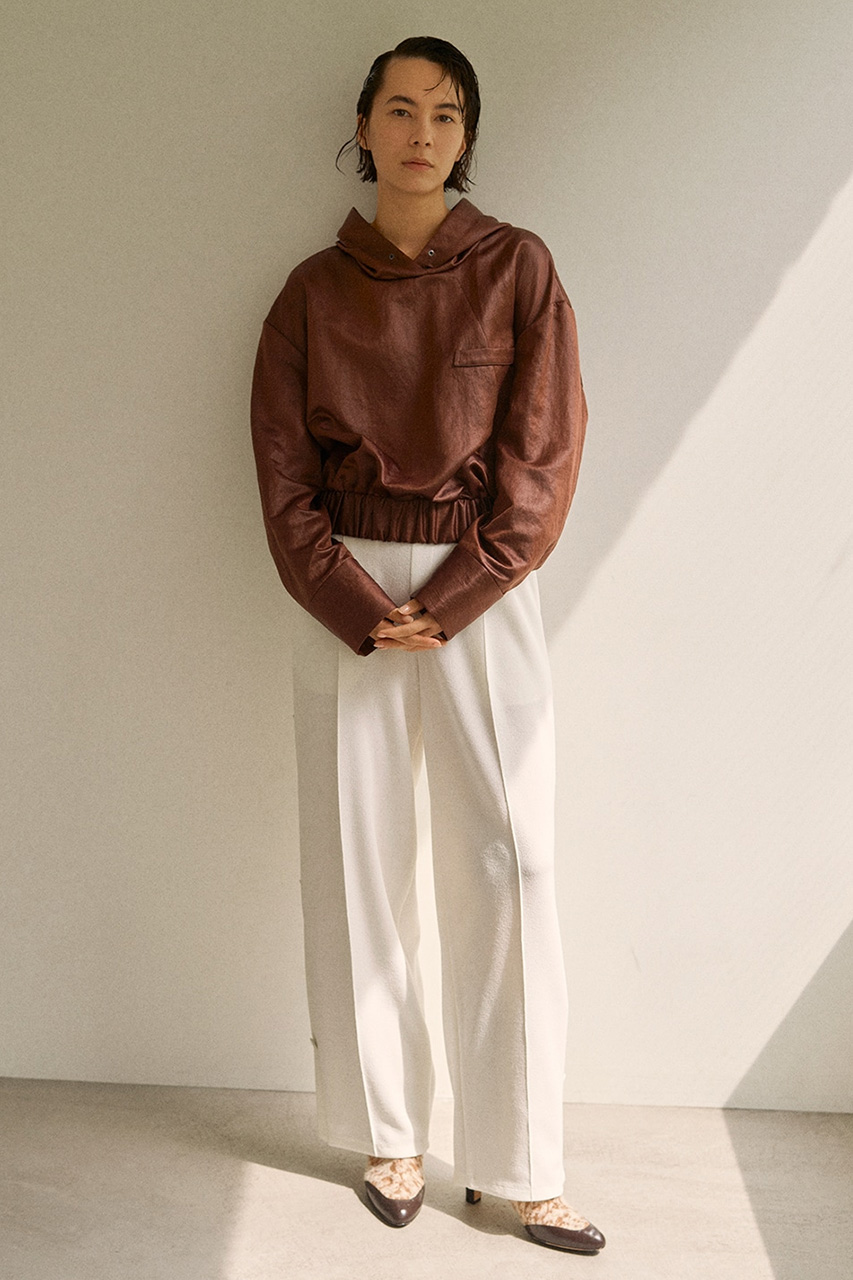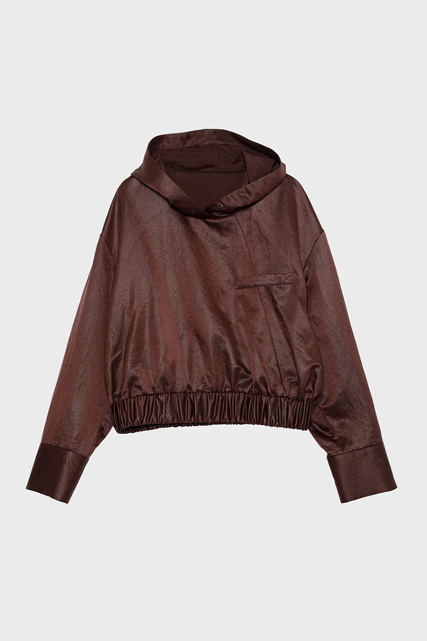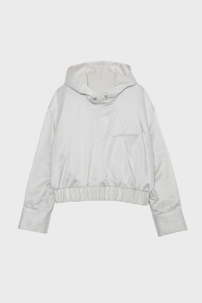 カジュアルな印象のフーディを陰影が美しい肉厚サテンで仕立て、エレガントな佇まいへと昇華させた一着。身体を包み込むようなボリュームのあるシルエットに対し、クロップ丈で全体のバランスを整えています。