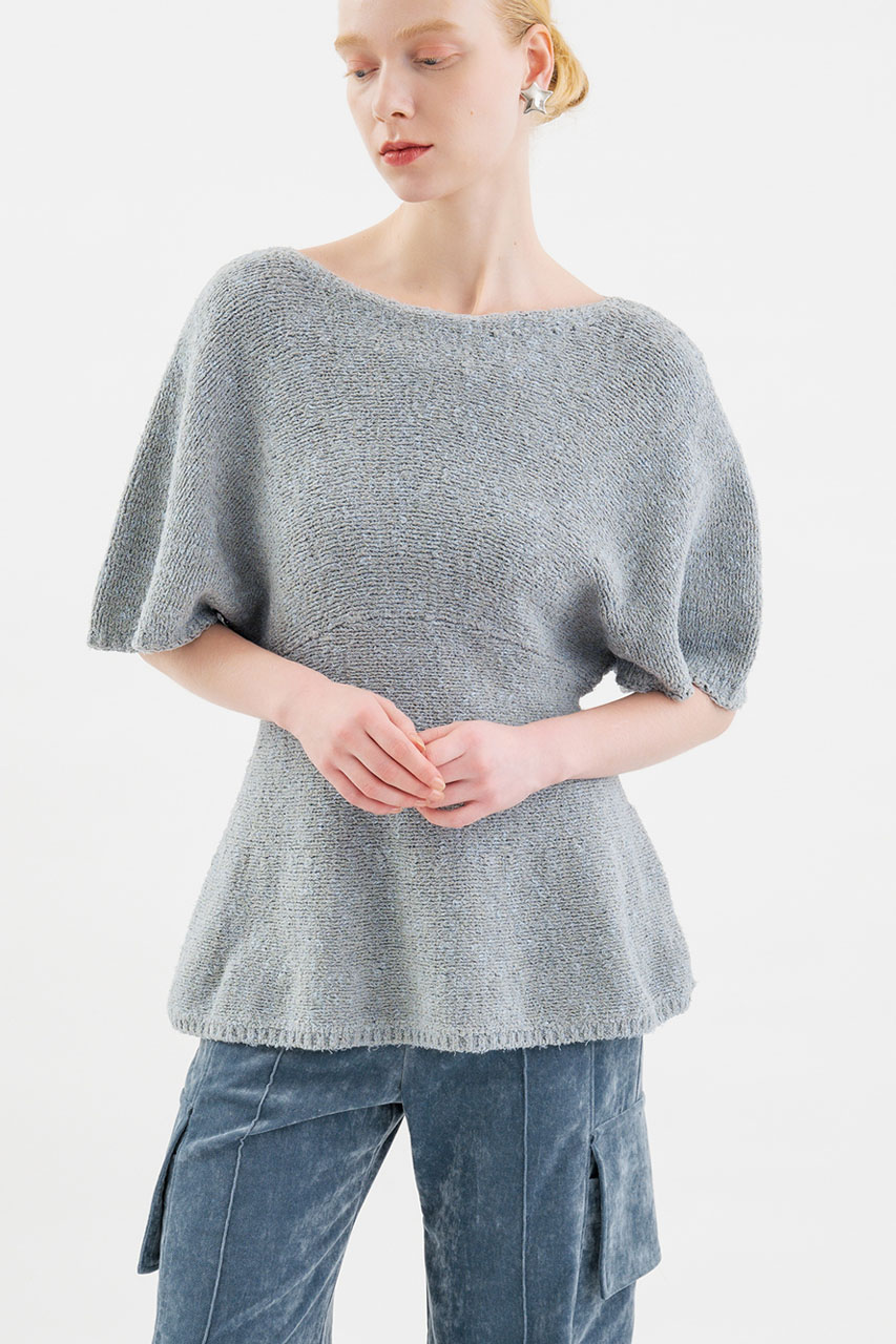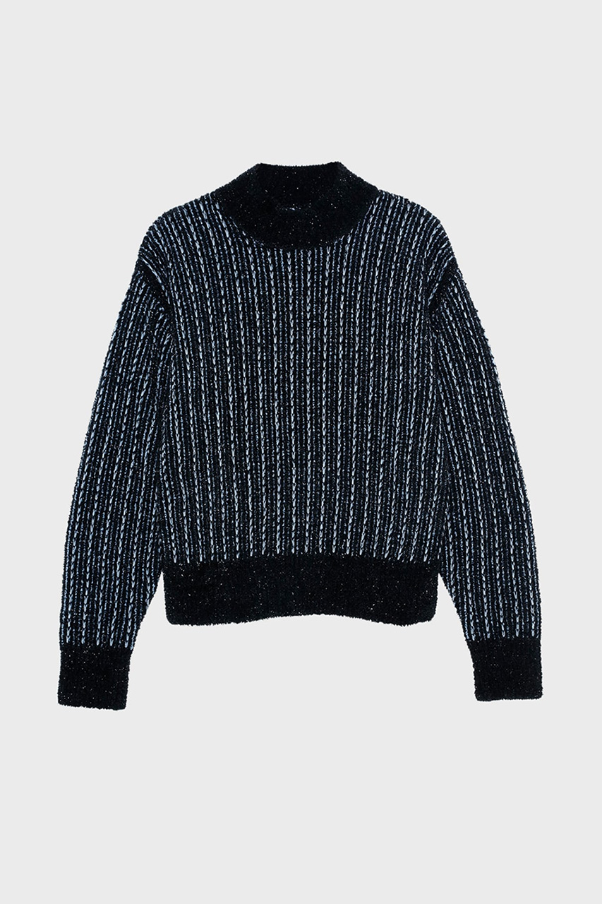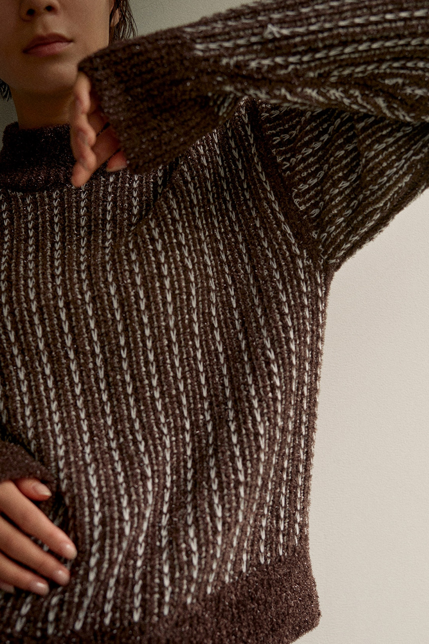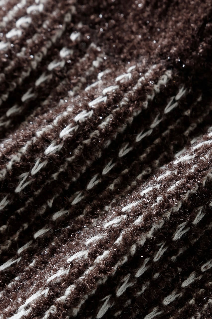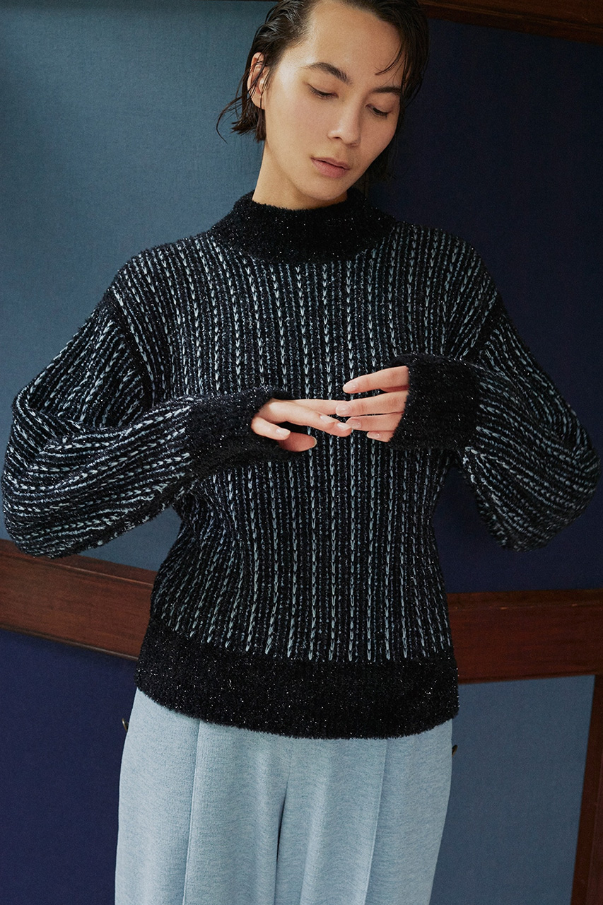 繊細な光を纏うニットプルオーバー。モールのように起毛した意匠糸が光をやわらかく反射し、通常のラメ糸とは異なる奥行きのある上品な輝きを作ります。